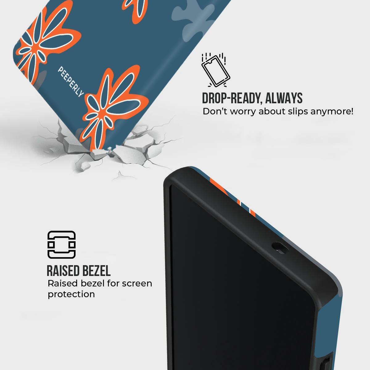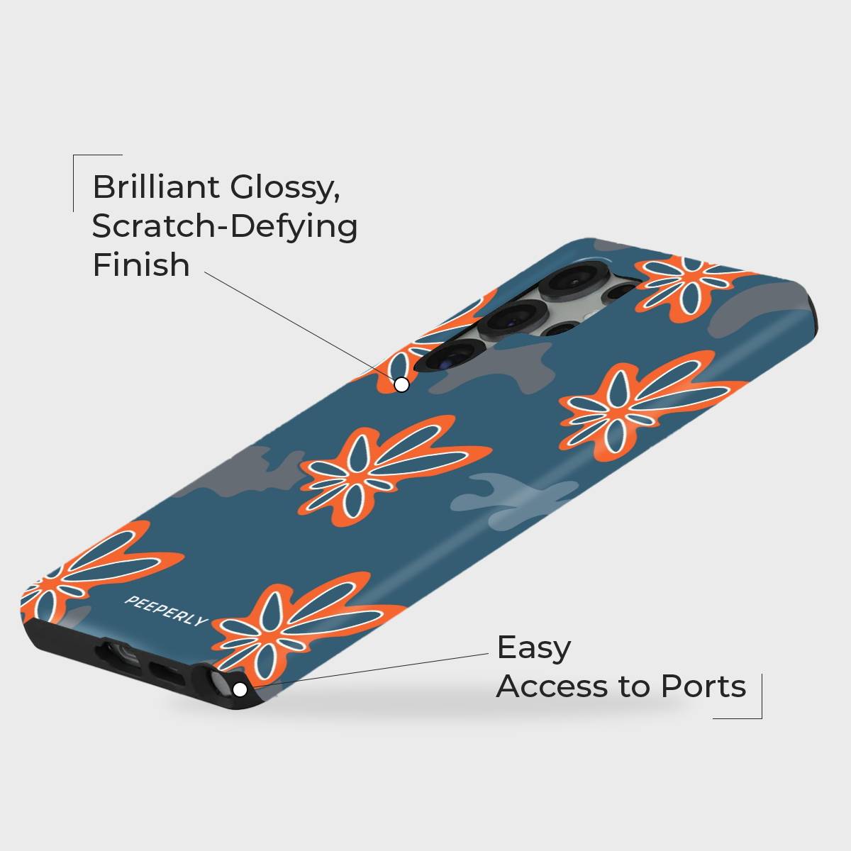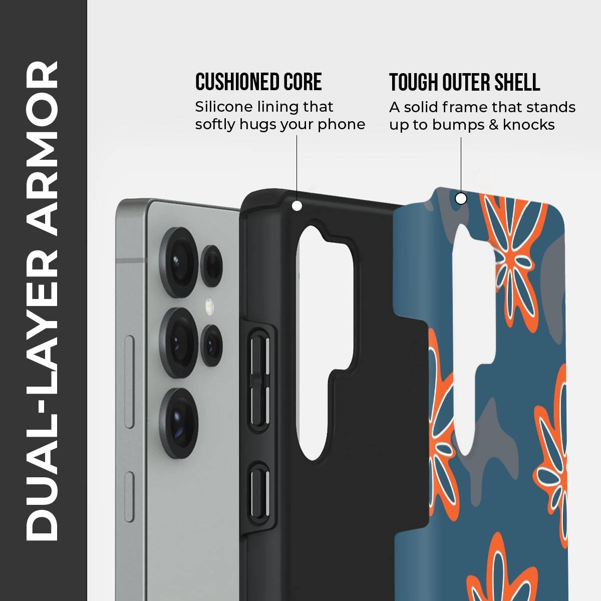 Bring a touch of vintage charm to your phone with this bold and stylish case. Featuring abstract leaf motifs outlined in vibrant orange against a cool blue backdrop with subtle camo accents, Retro Leaves combines retro flair with modern edge.