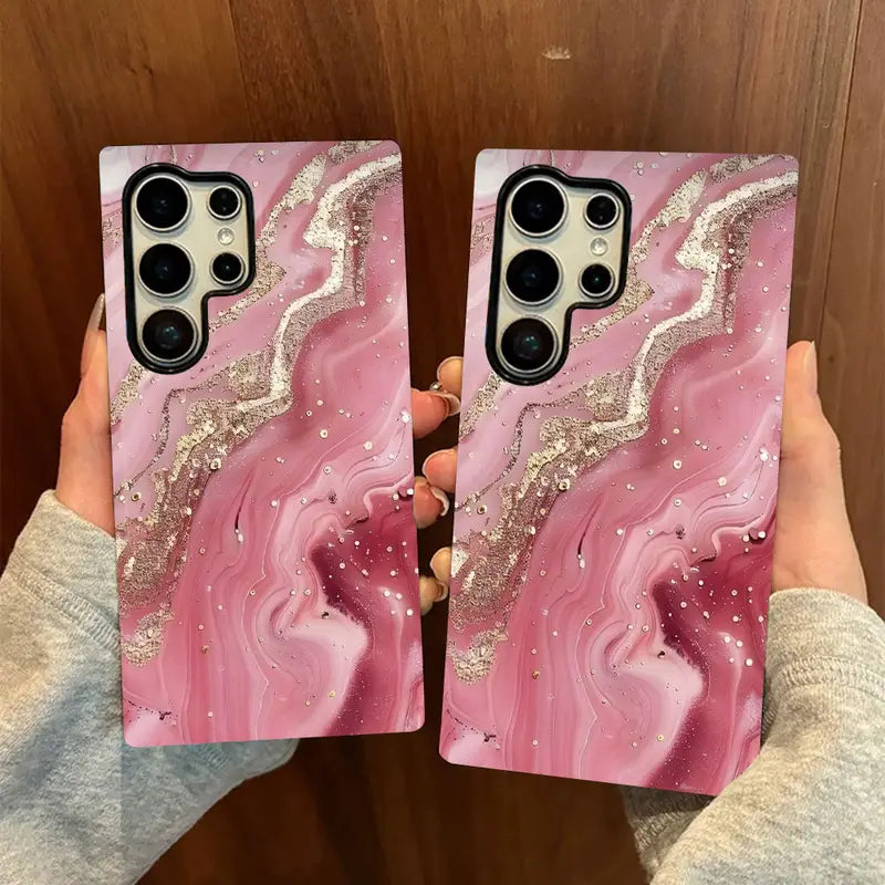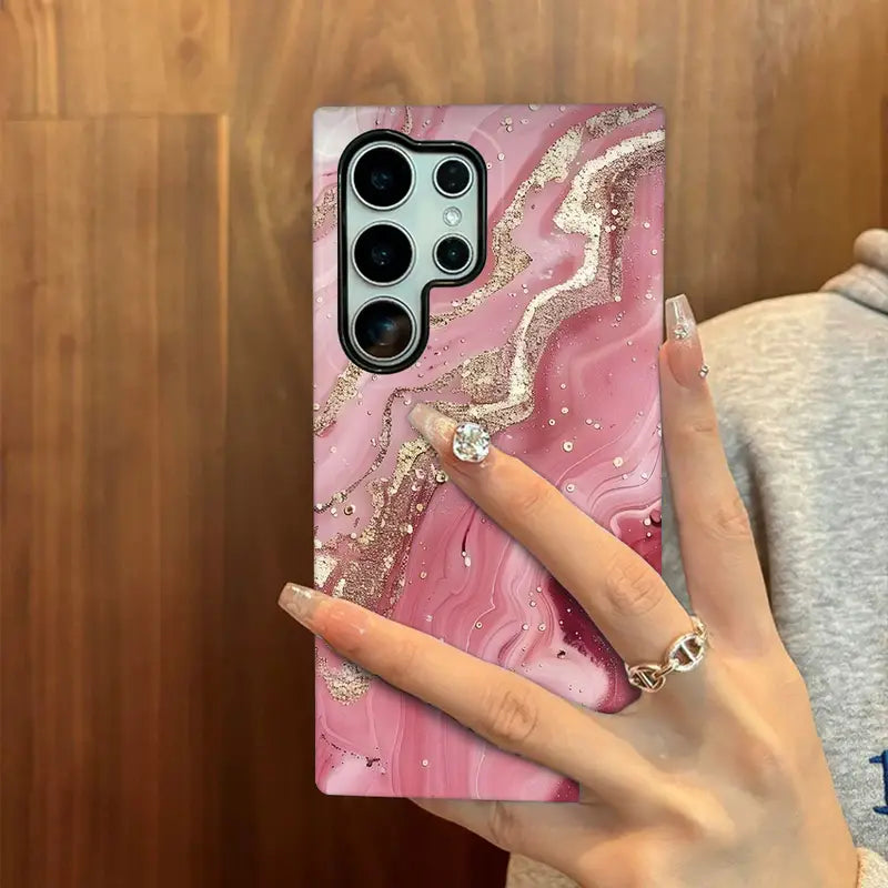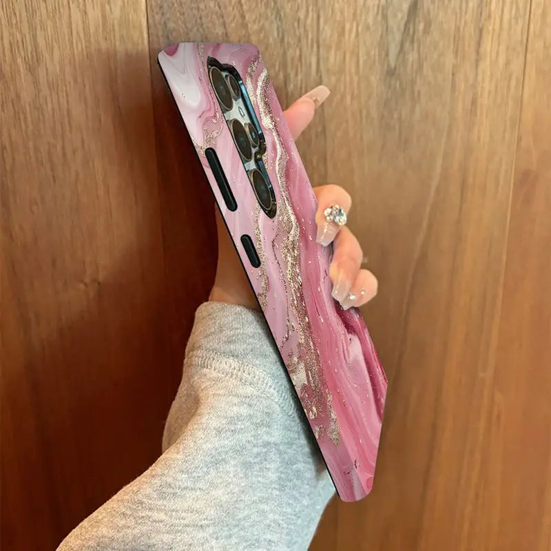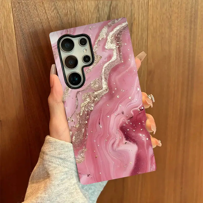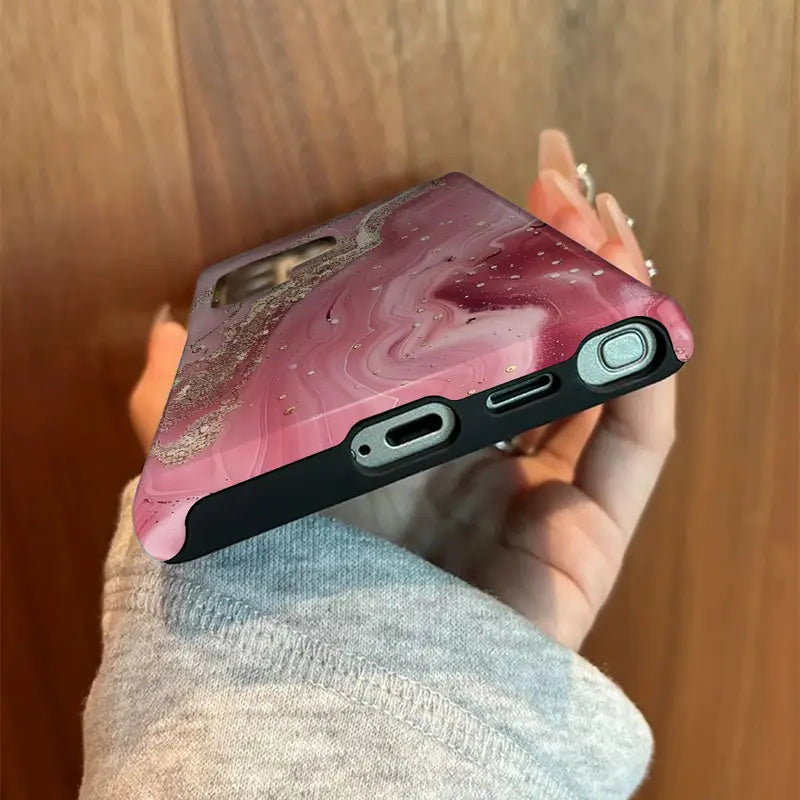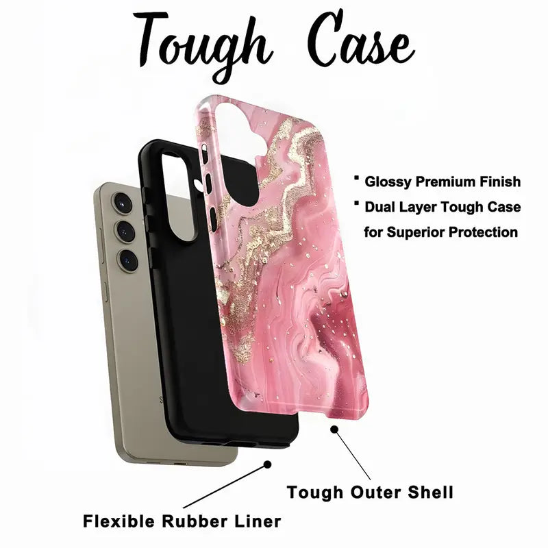 Wrap your phone in pure elegance with the Rosy Quartz Case, a stunning blend of glamour and grace. Inspired by the soft beauty of rose quartz crystals, this case showcases a swirling pink marble design accentuated with delicate golden veins and shimmering details.