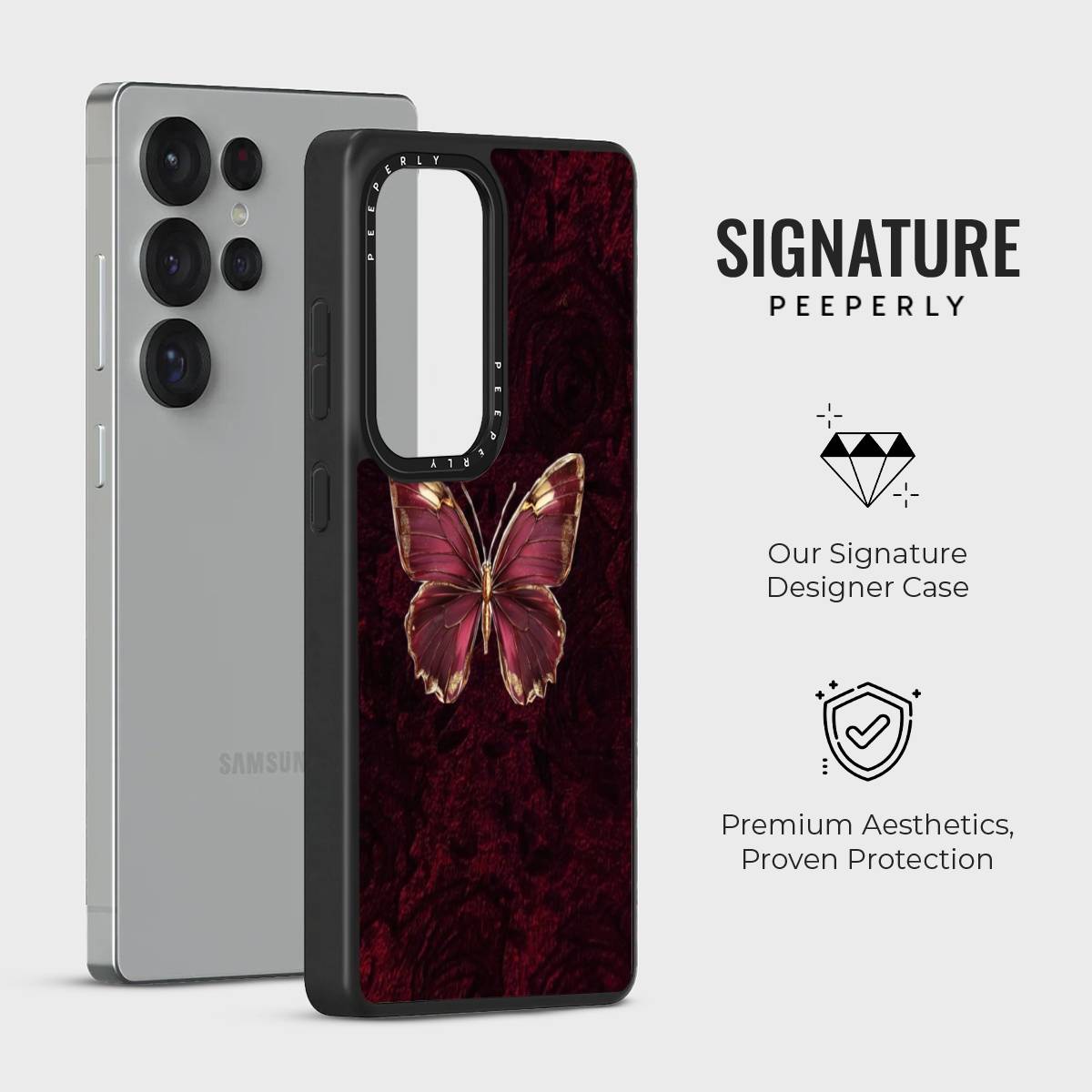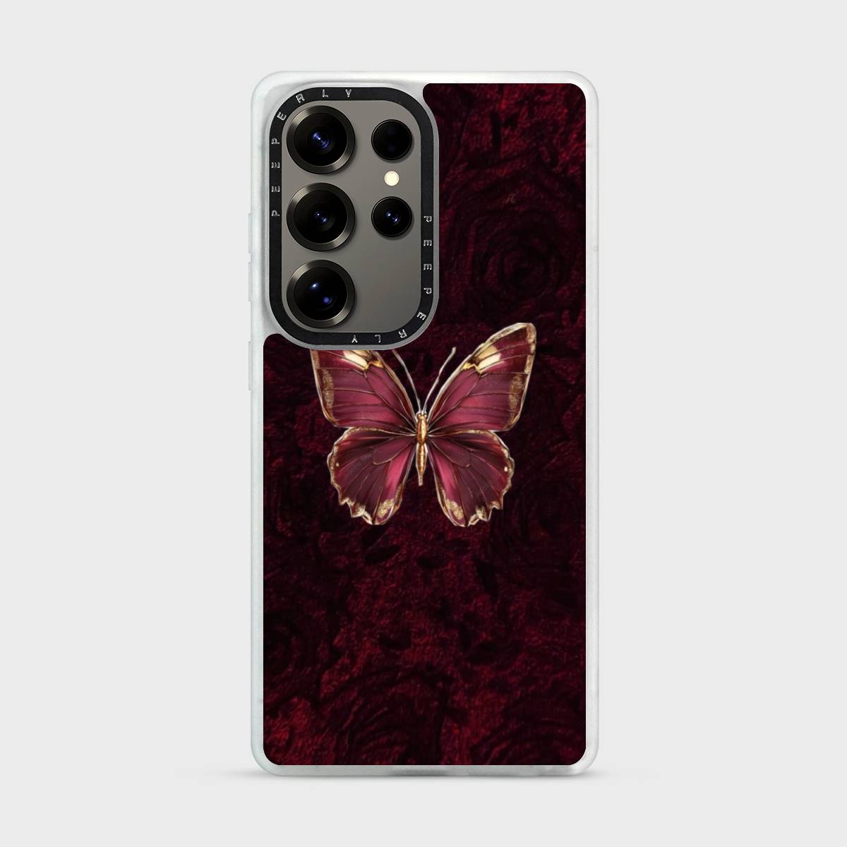 Ruby Metamorph symbolizes transformation wrapped in luxury—an elegant butterfly rendered in rich ruby tones with golden accents, emerging against a deep, velvety backdrop. The design evokes rebirth, power, and refinement, blending dramatic beauty with a sense of timeless sophistication.
