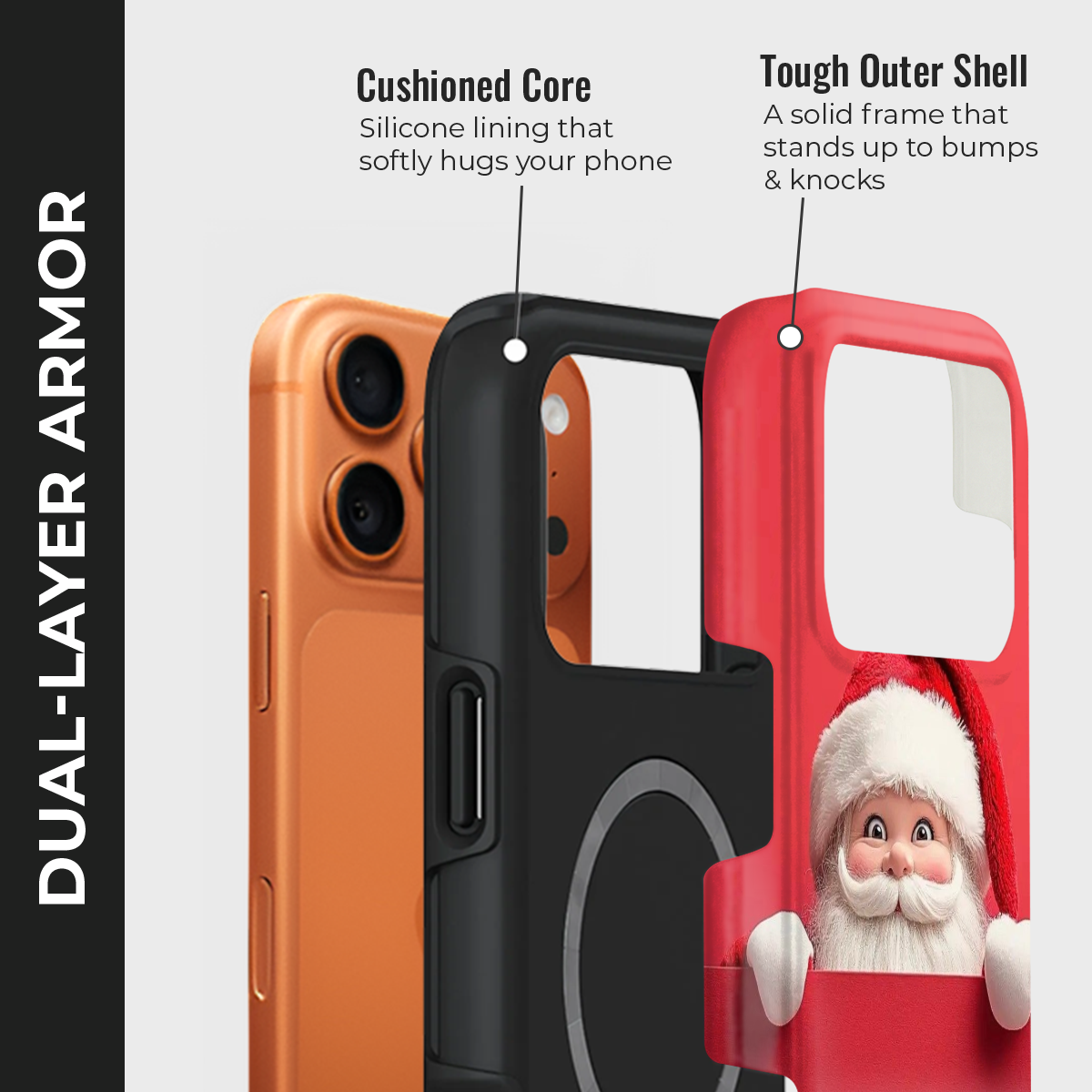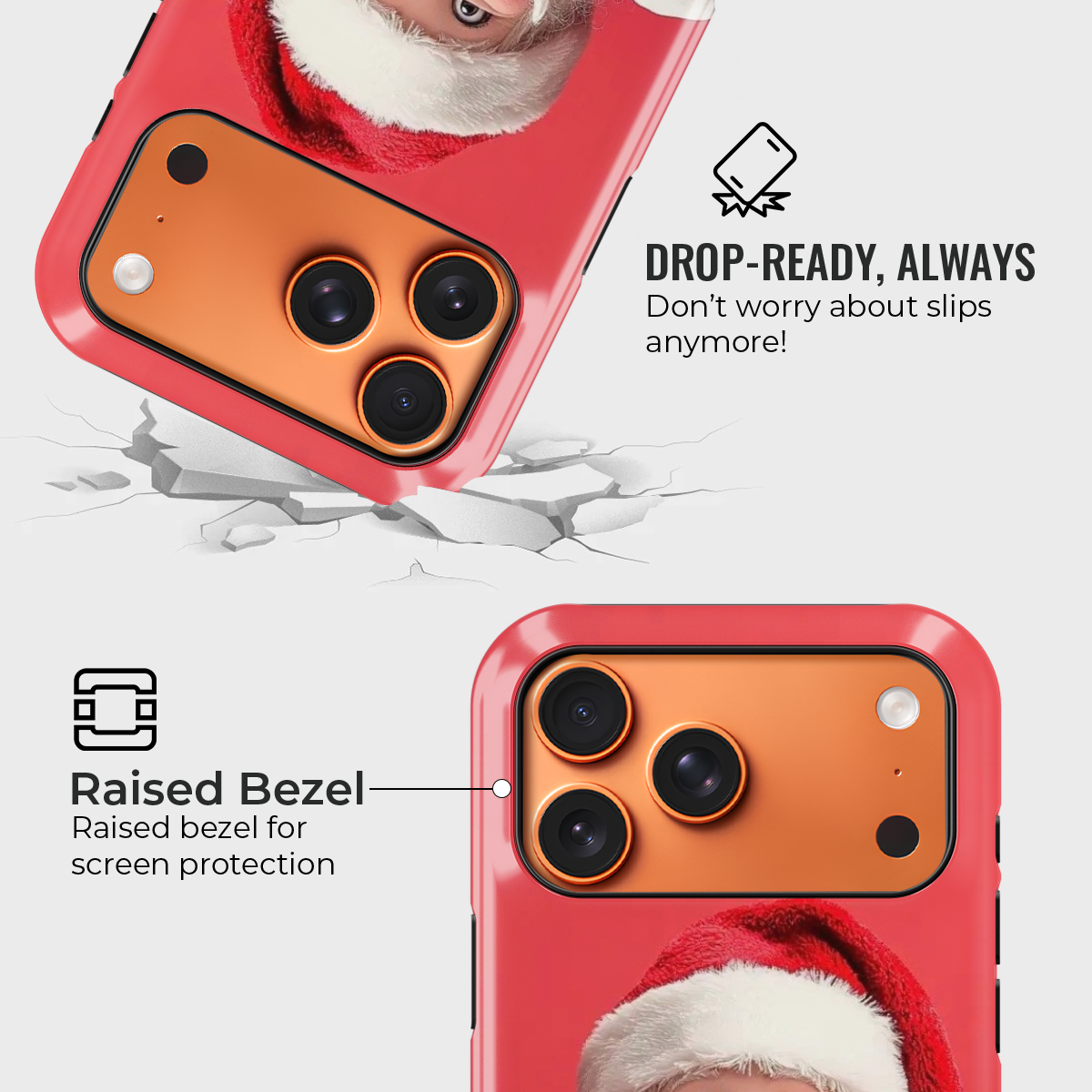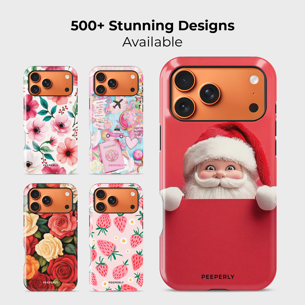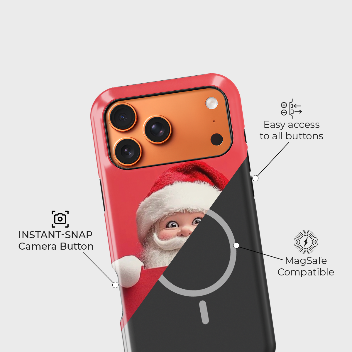 Add a joyful twist to your holiday style with the Santa Surprise phone case. Featuring a playful peek-a-boo Santa design against a rich festive red backdrop, this case captures the magic and fun of the Christmas season.