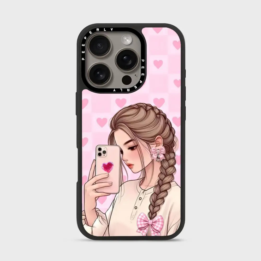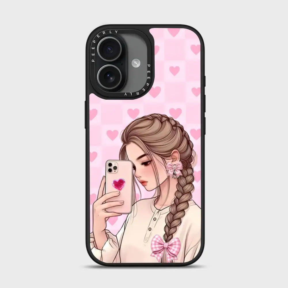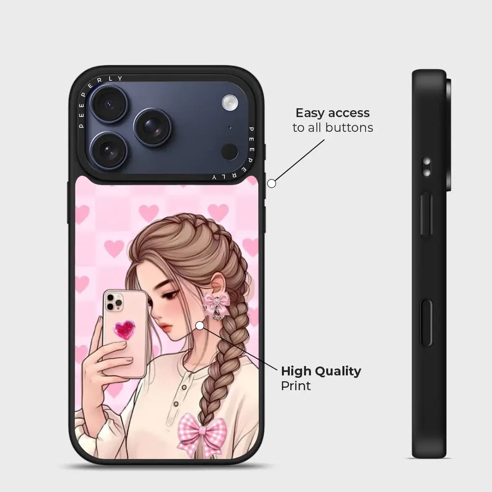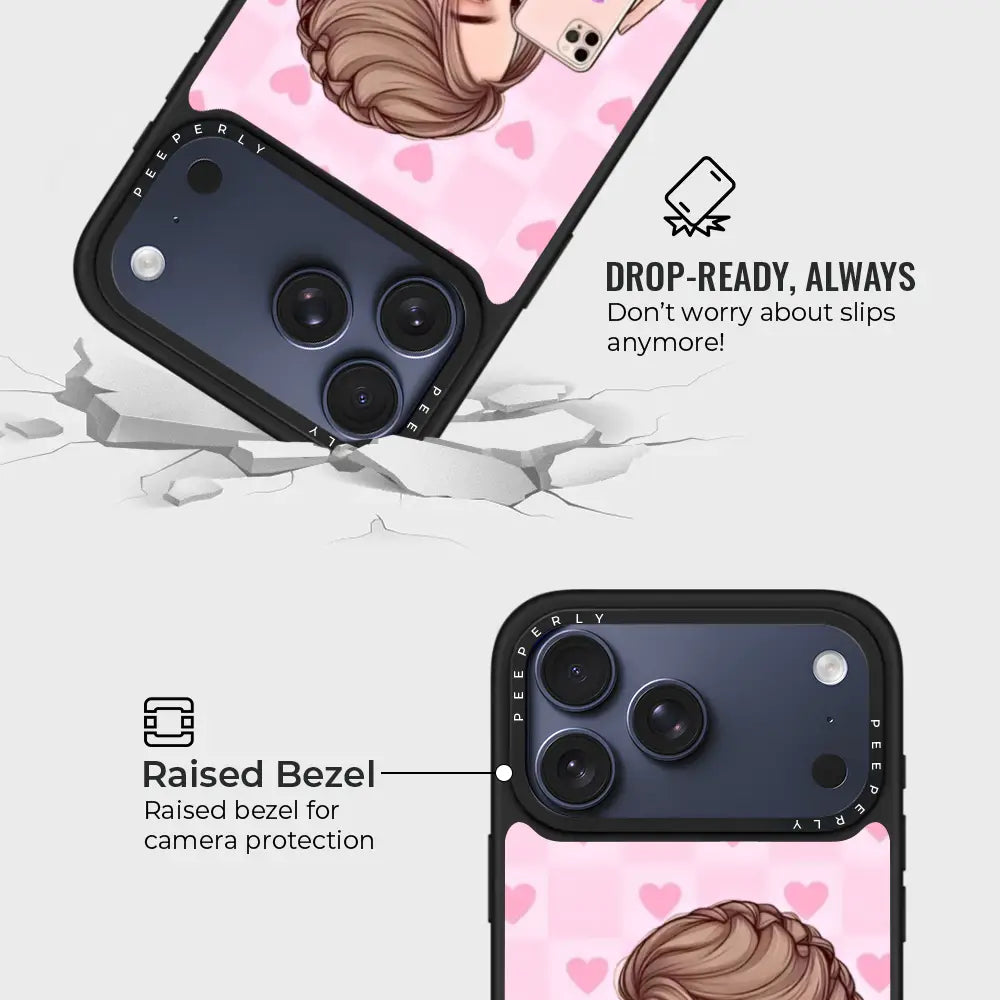 Selfie Crush is all about soft charm and modern romance. Featuring a dreamy illustrated selfie girl set against a blush-pink heart backdrop, this case brings cozy aesthetic vibes to your everyday style. The glossy finish and delicate details make it the perfect pick for anyone who loves cute, expressive designs with a touch of sweetness.