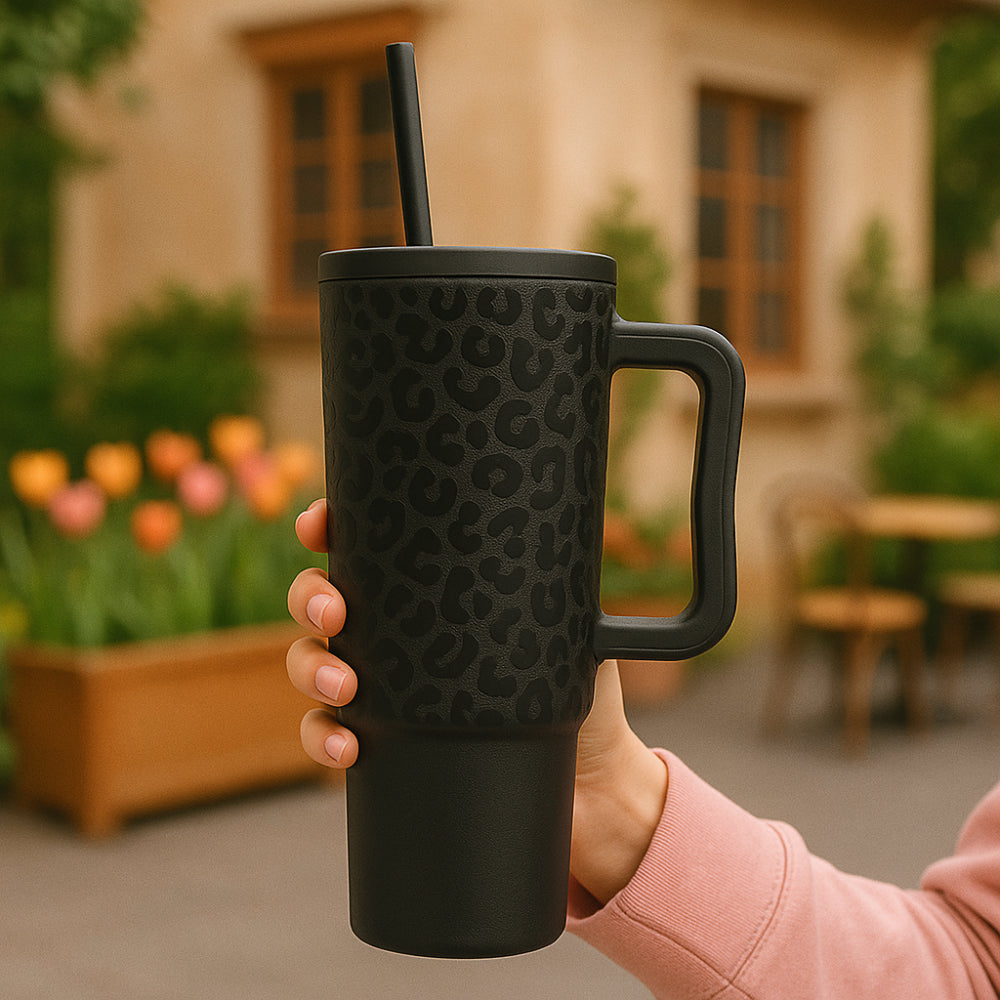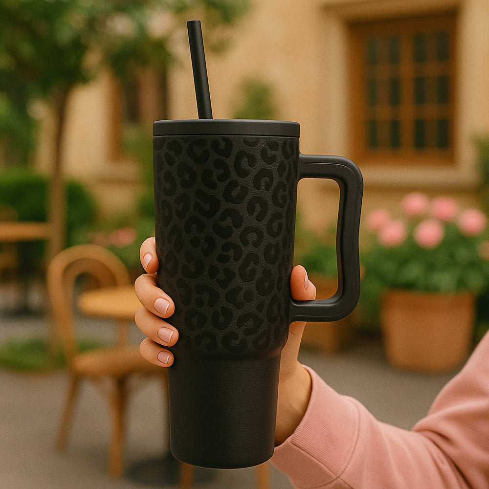 Bold in black and fierce in form, the Shadow Sip Tumbler brings a sleek edge to your daily hydration. Featuring a matte finish with an embossed leopard texture, this tumbler blends wild style with modern minimalism. Crafted for function and flair, it keeps your drinks at the perfect temperature and fits effortlessly into car cup holders.