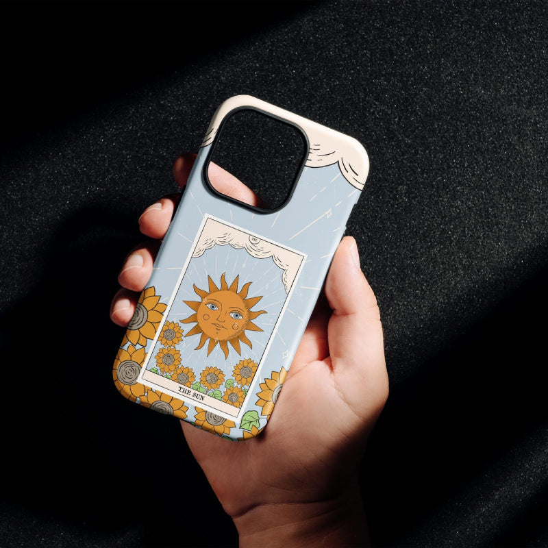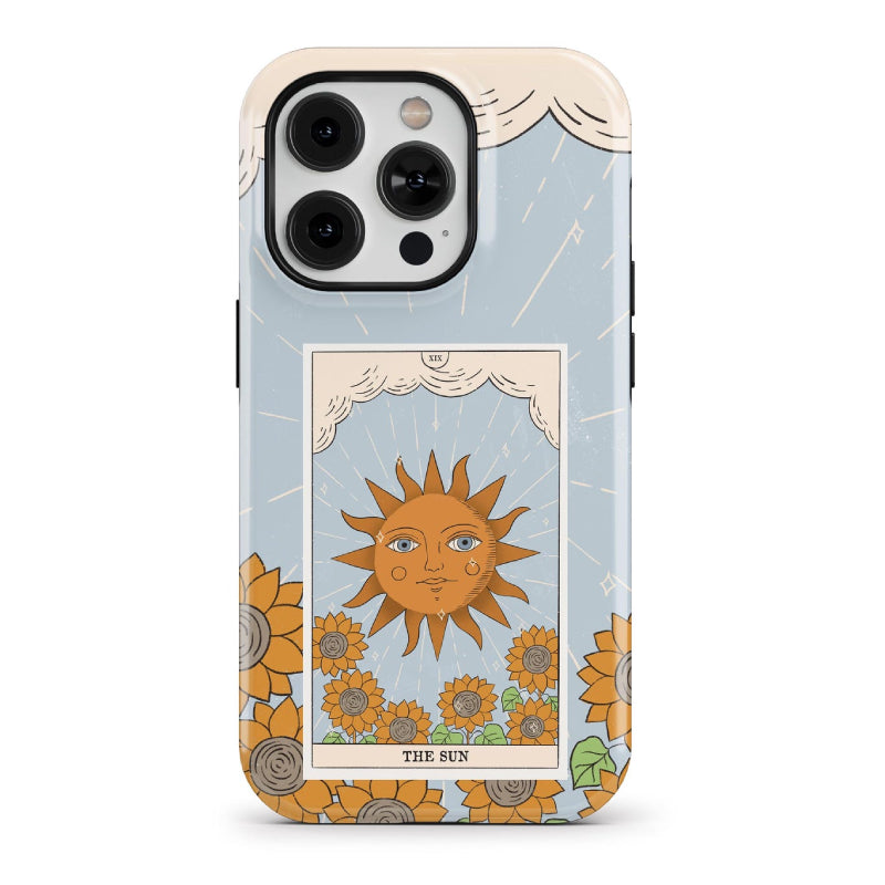Solar Arcana draws inspiration from The Sun tarot card, symbolizing joy, clarity, and radiant energy. Framed like a vintage tarot illustration, a glowing sun rises above blooming sunflowers against a pale sky, scattering light in gentle, celestial rays.