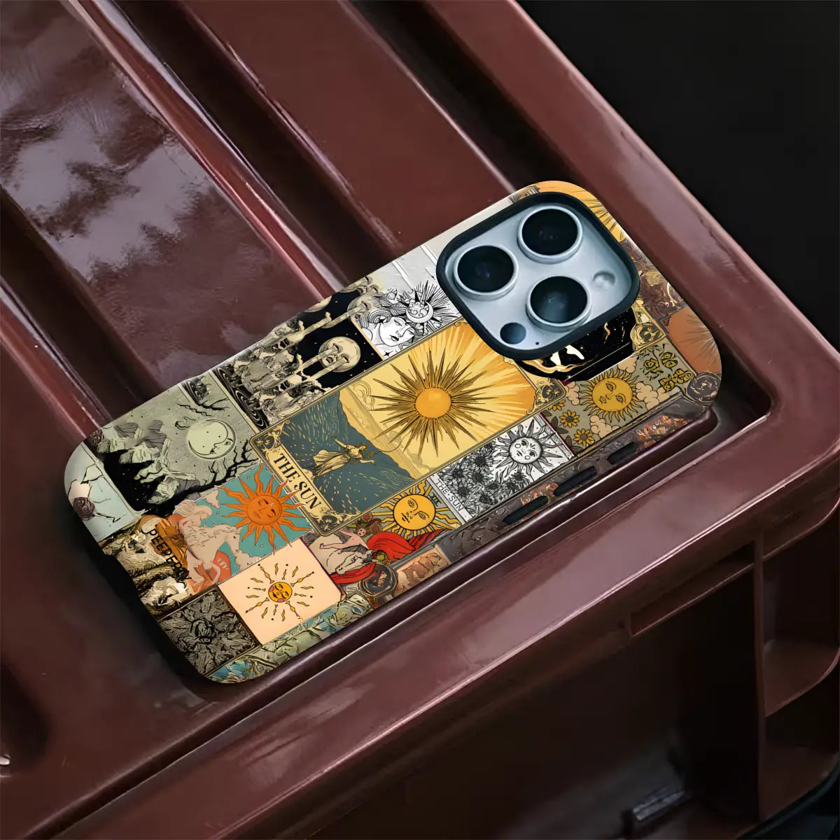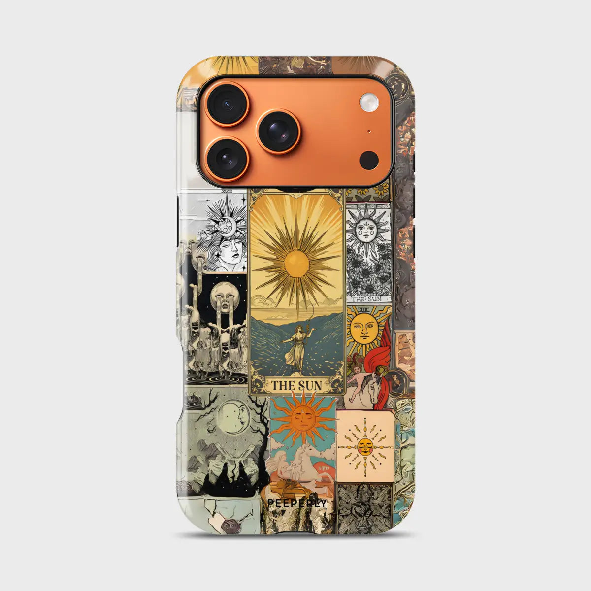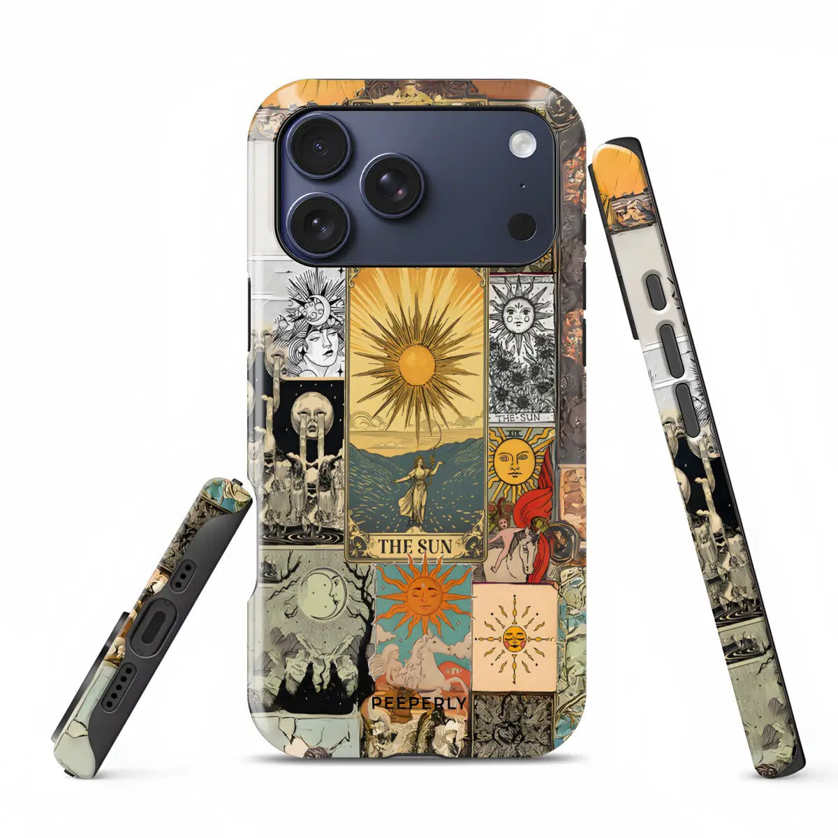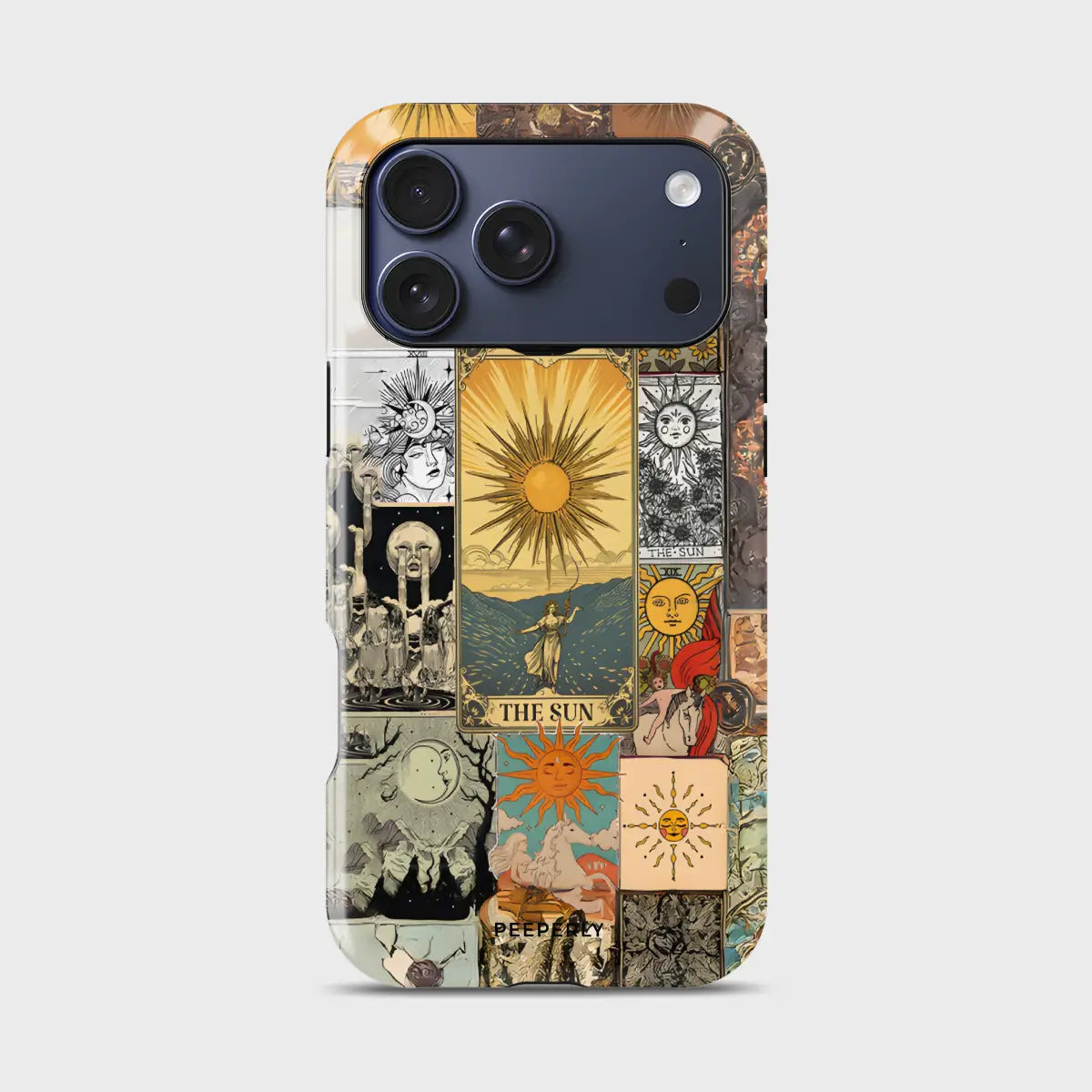Solar Prophecy weaves together a striking collage of vintage Sun tarot imagery, drawing from centuries of esoteric art and symbolism. Layered illustrations—golden suns, celestial figures, and arcane scenes—merge into a powerful visual narrative centered on illumination, truth, and divine clarity. The warm, timeworn palette gives the design an antique, almost talismanic presence.