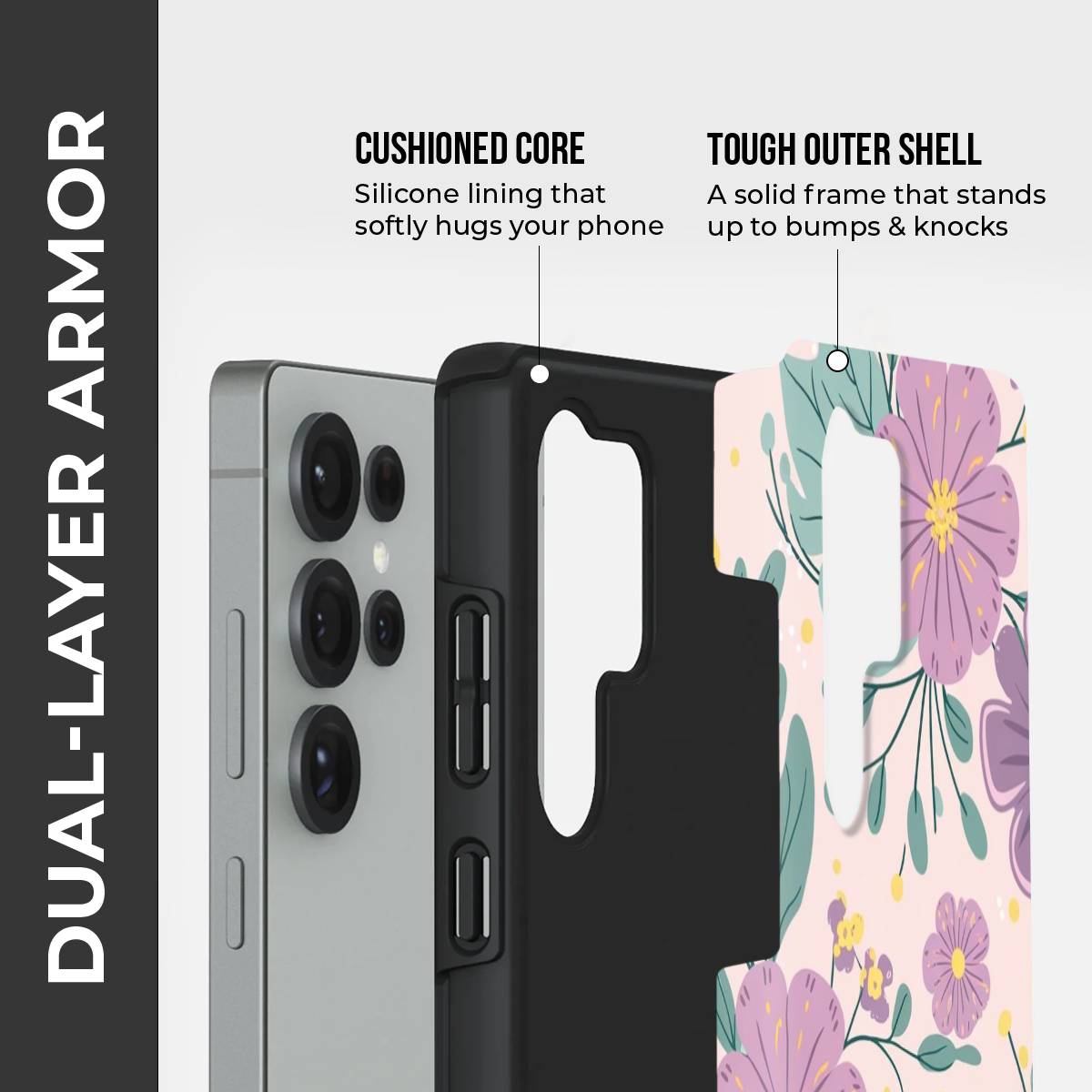 Delicate, playful, and full of charm—Spring Whimsy captures the lighthearted joy of a blooming spring day. With soft lilac and yellow flowers dancing across a blush background, this case adds a fresh pop of pastel to your everyday style.