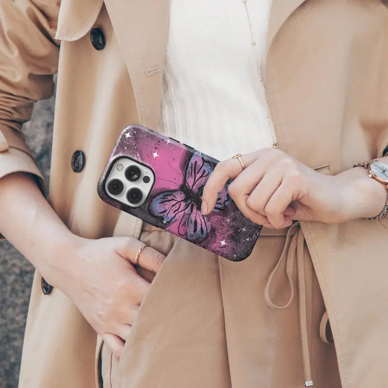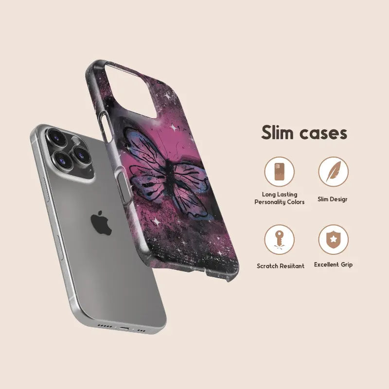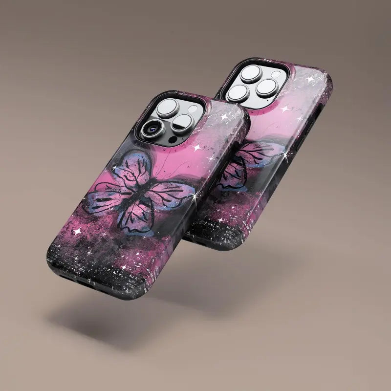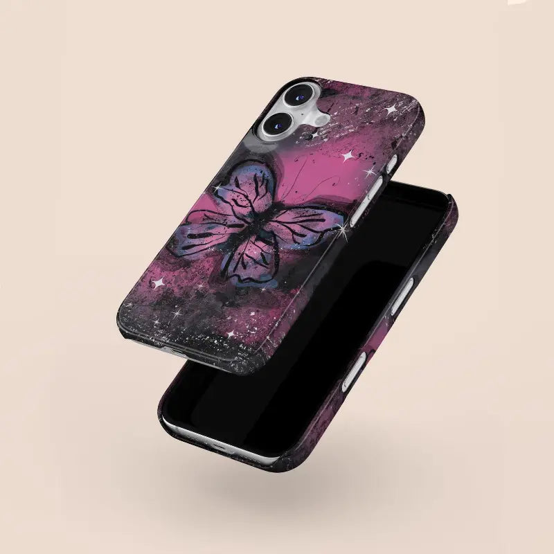 Starlit Metamorphosis captures the moment of transformation beneath a cosmic sky. A luminous butterfly spreads its wings across a galaxy of deep pinks, inky blacks, and scattered starlight, blending celestial energy with raw, expressive texture. The contrast between light and shadow gives the design a sense of movement and depth—mysterious, yet hopeful.