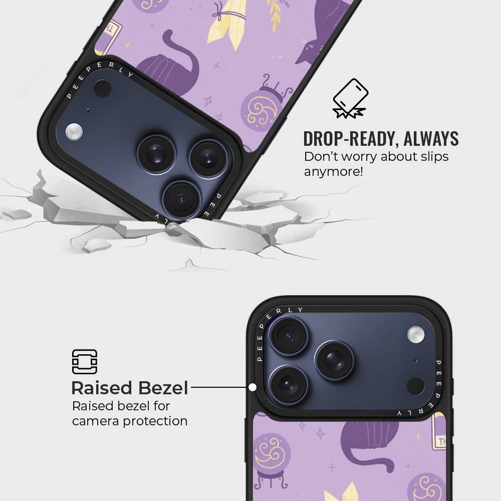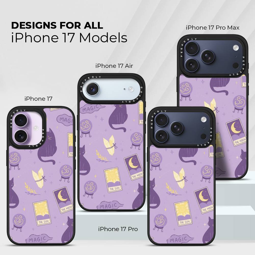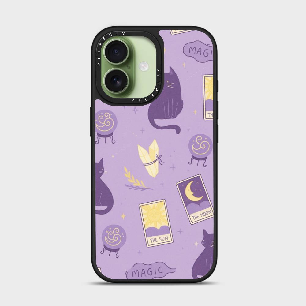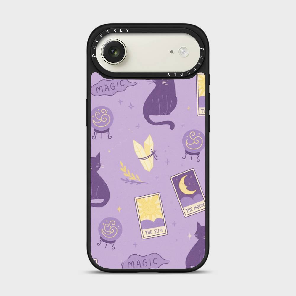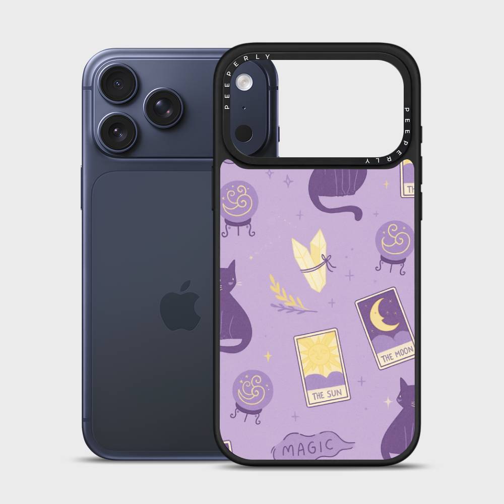 Step into a world of charm and cosmic wonder with Starry Meow — a phone case where tarot cards, black cats, and shimmering crystals come together under a lavender starlit sky. With playful illustrations of the sun and moon cards, crystal balls, and a curious feline companion, this design is perfect for lovers of all things mystical, magical, and meow-gical.