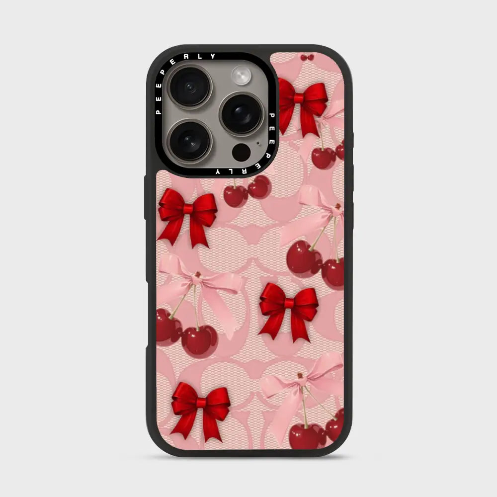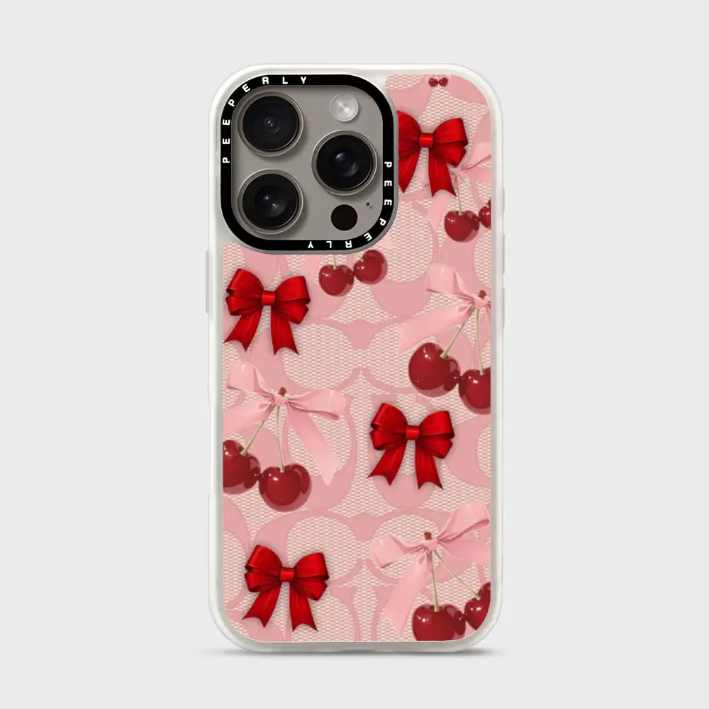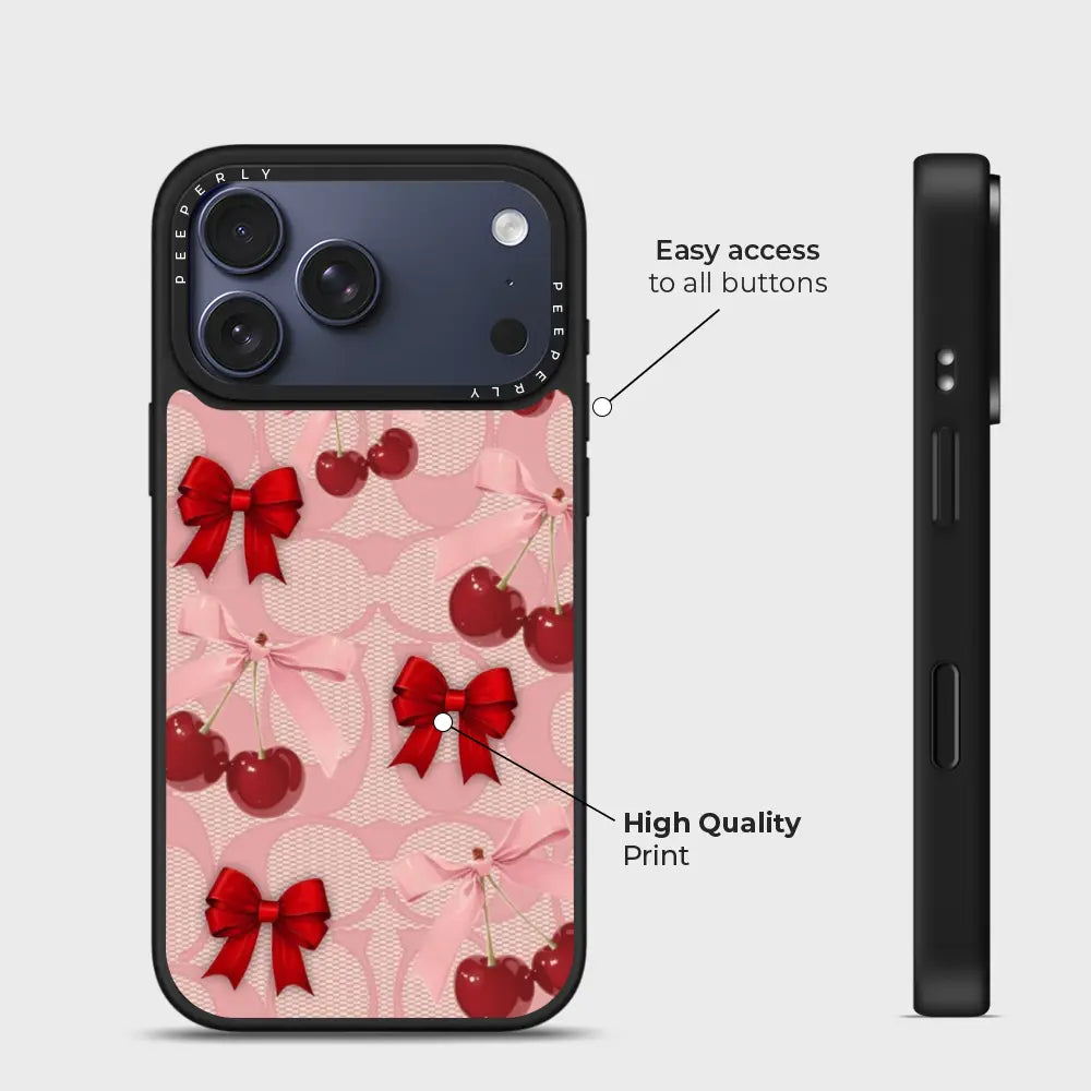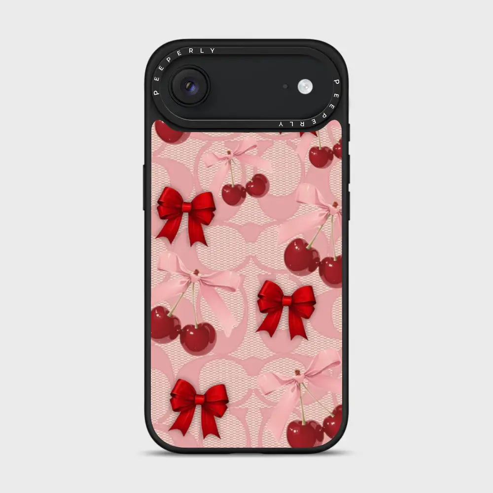 A dreamy pink blend of glossy cherries and dainty ribbon bows, sprinkled with soft romantic charm. This design feels sweet, playful, and effortlessly elegant—like a candy-coated love note wrapped in satin.