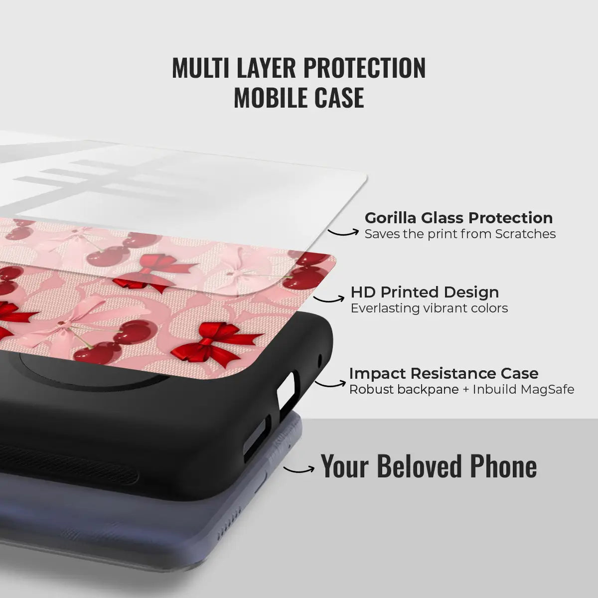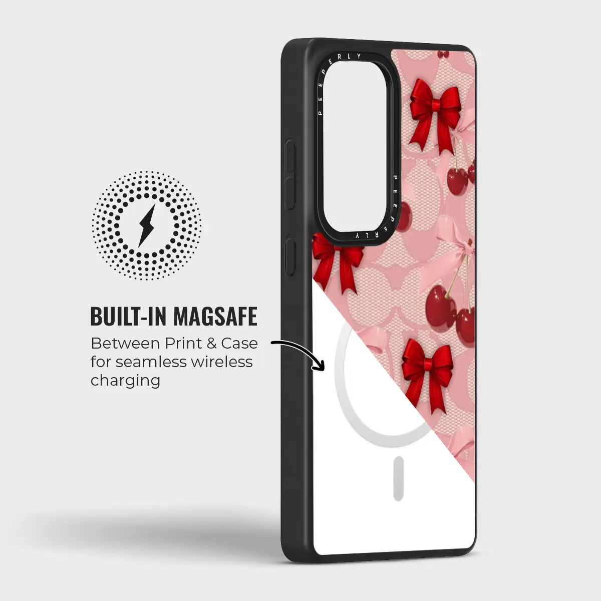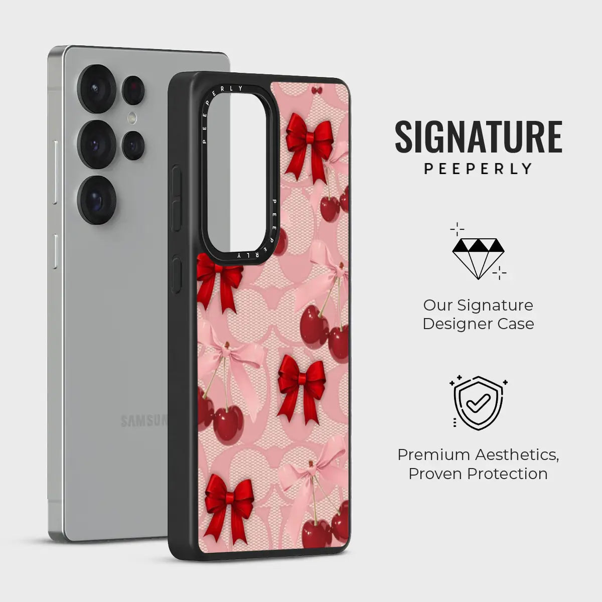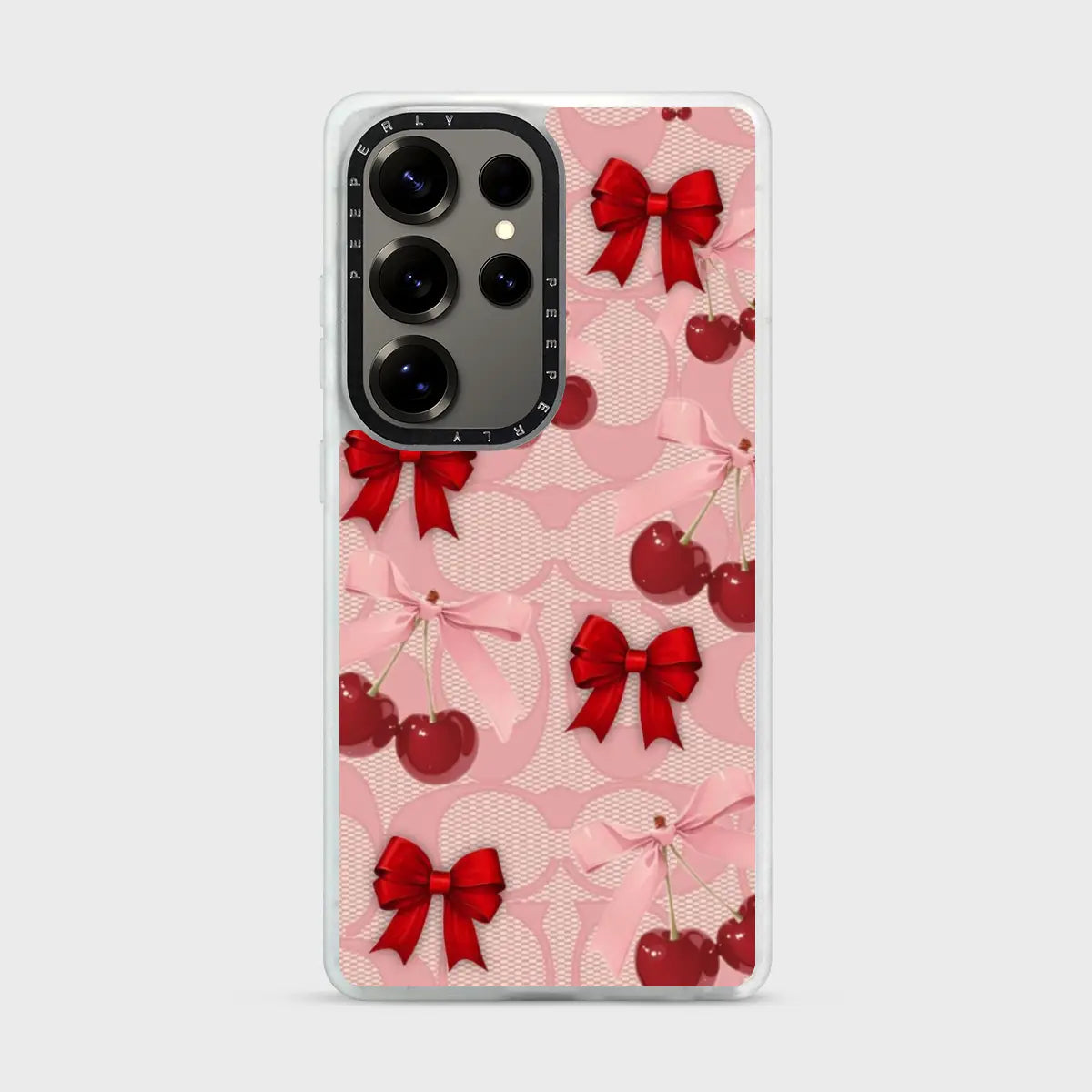 A dreamy pink blend of glossy cherries and dainty ribbon bows, sprinkled with soft romantic charm. This design feels sweet, playful, and effortlessly elegant—like a candy-coated love note wrapped in satin.