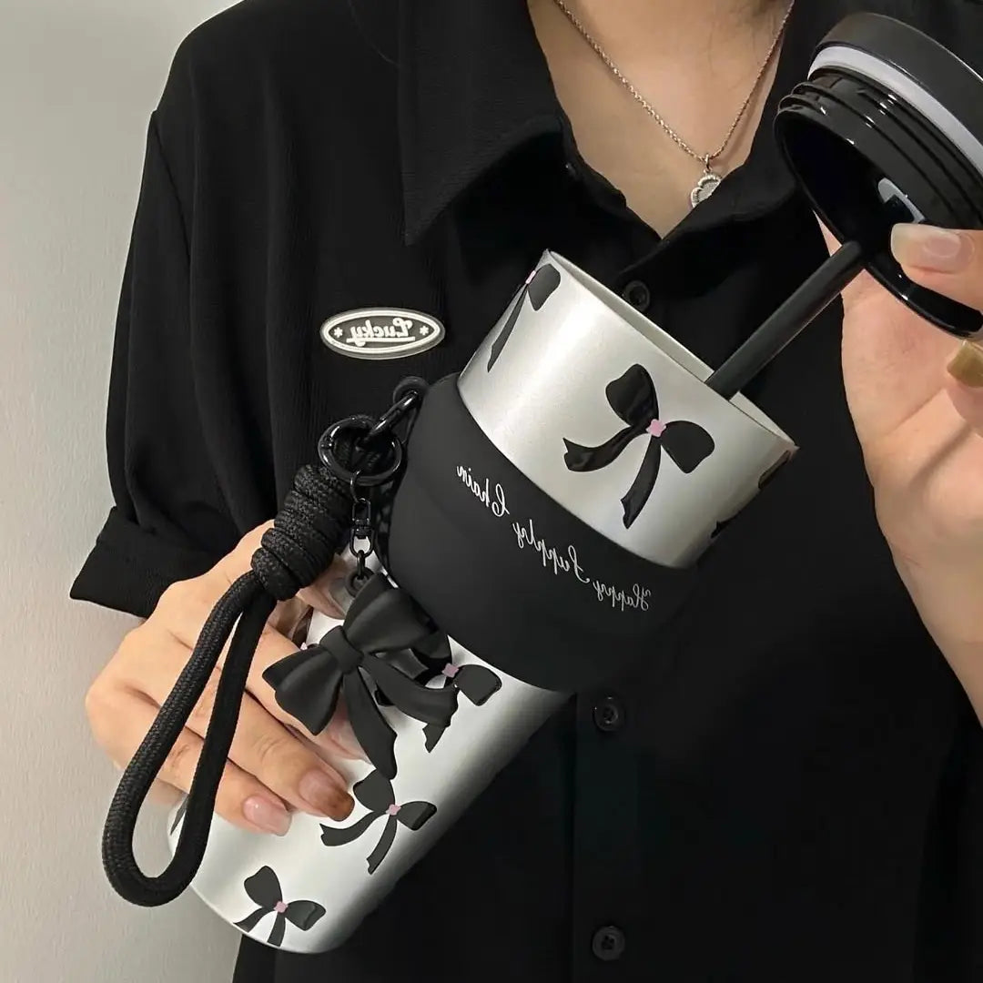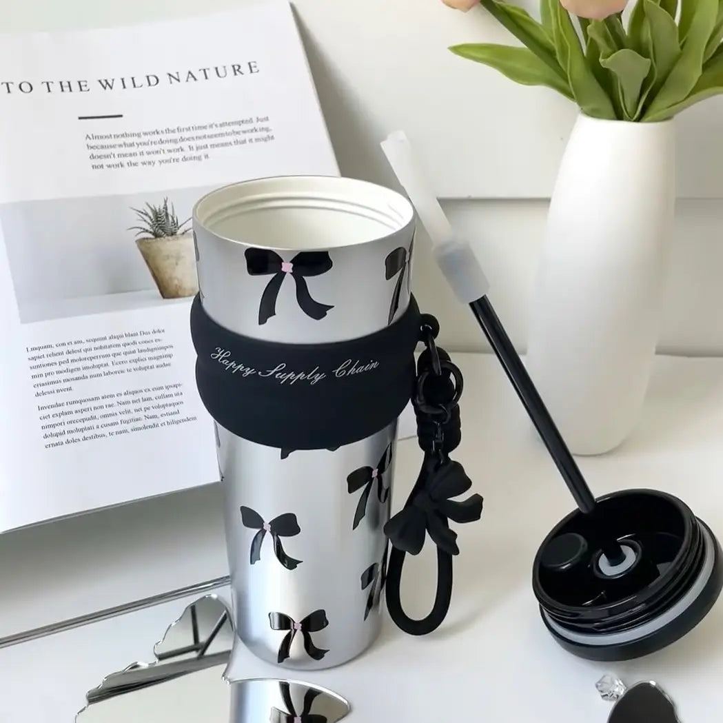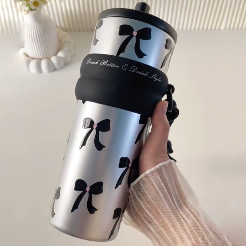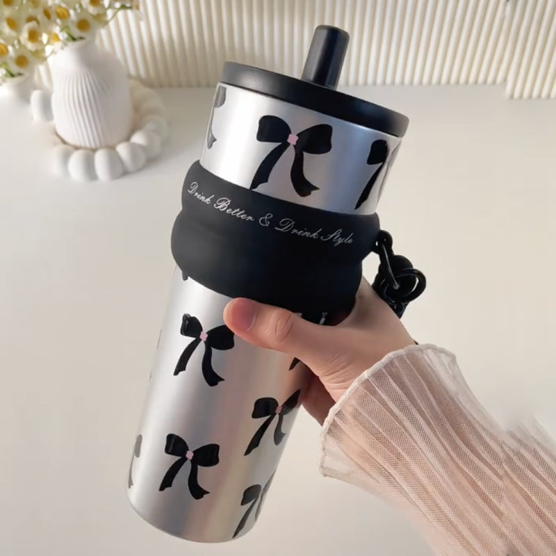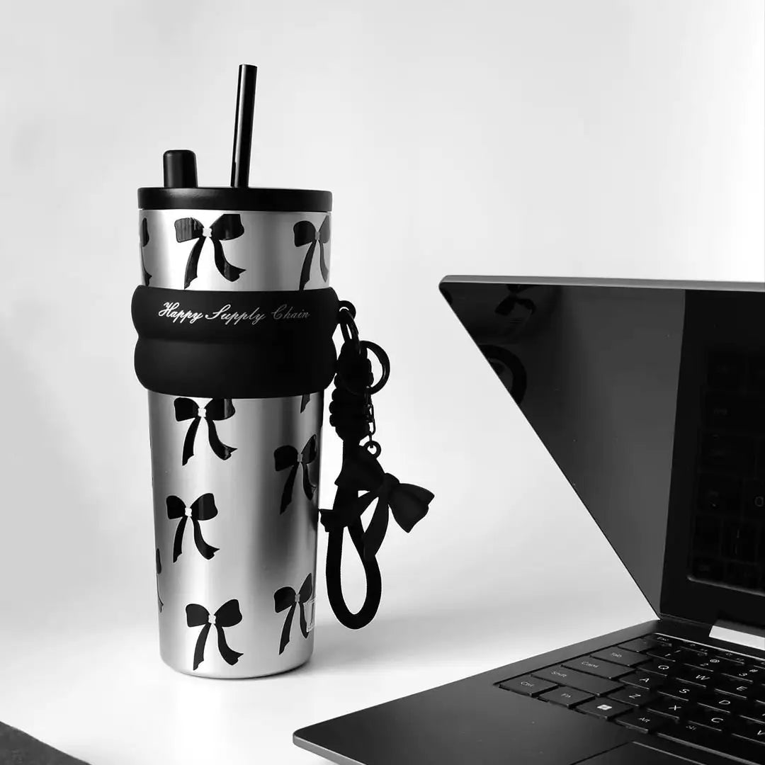 The Sweet Bow Pattern Tumbler blends elegance and charm with everyday functionality. Featuring a delicate black bow design with soft accent details, it creates a stylish, aesthetic look that stands out.