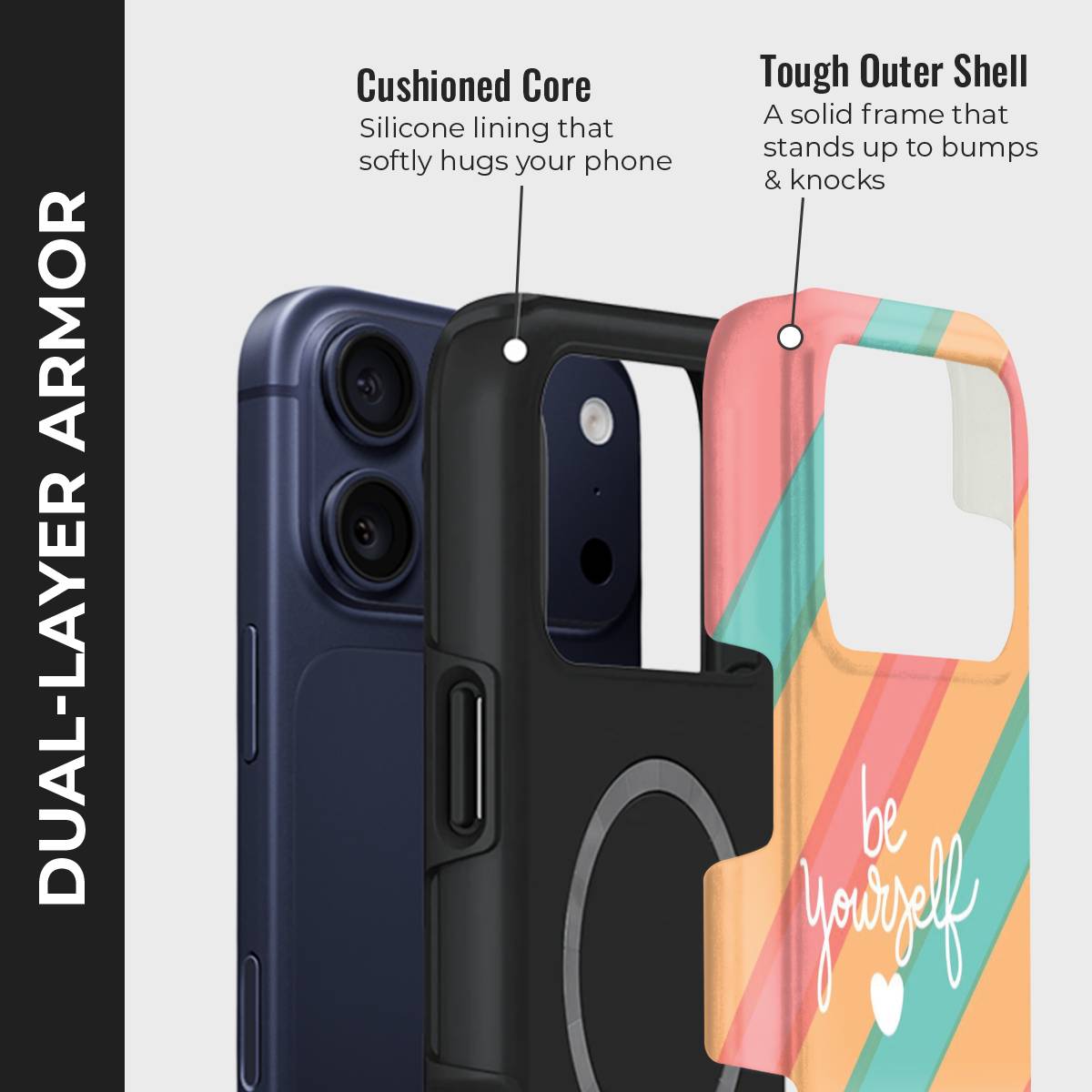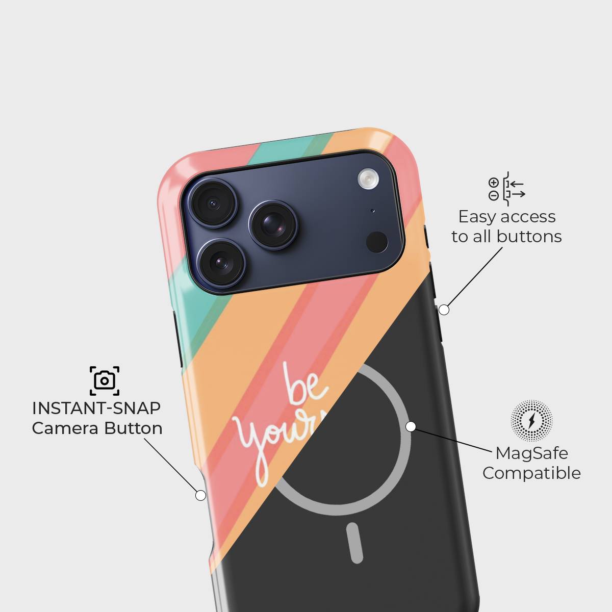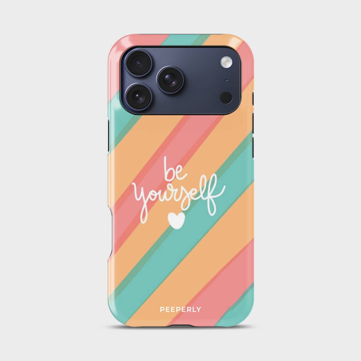 Step into your power with this bold yet uplifting design. Featuring vibrant diagonal stripes in coral, peach, and teal, accented by a playful handwritten script, this case is a celebration of authenticity. The heart detail adds a gentle reminder to embrace your true self, while the cheerful colors radiate positivity.