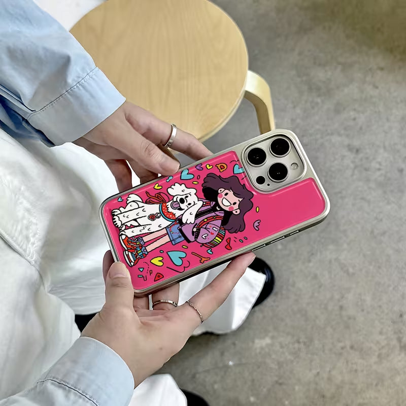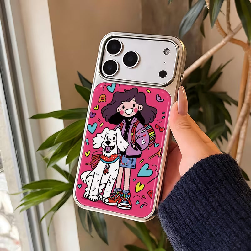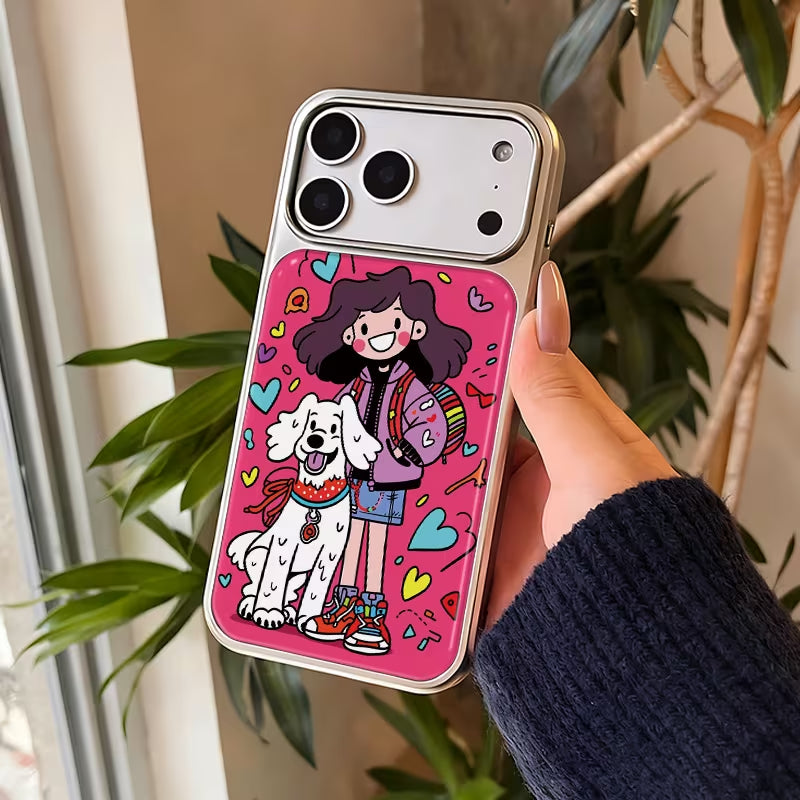 A bright and joyful design celebrating friendship and everyday adventures, featuring a happy girl and her loyal pup surrounded by colorful hearts. Playful lines and bold colors capture the simple magic of walks together—perfect for dog lovers and those who cherish cheerful, feel-good moments.