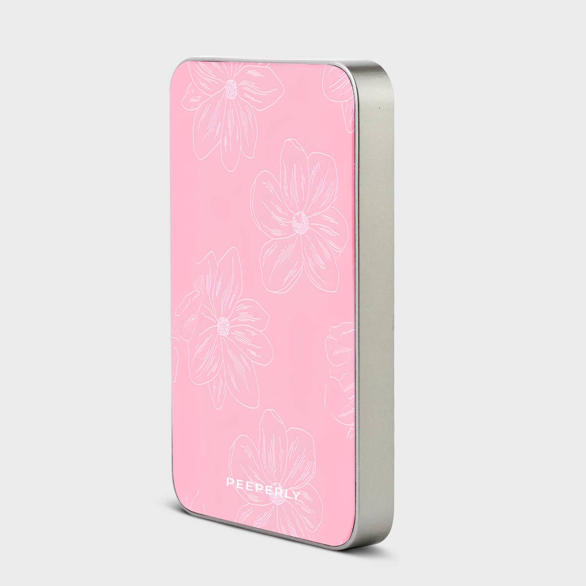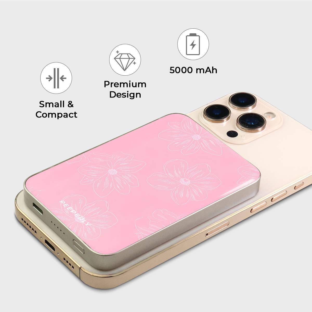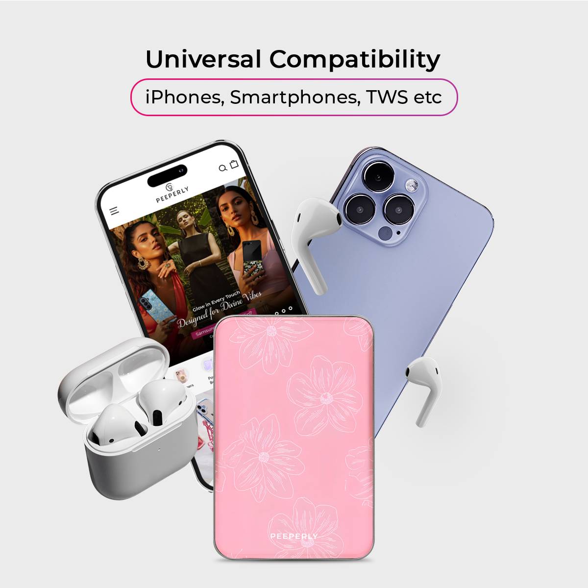 The White Flora Magnetic Power Bank features a gentle pink backdrop adorned with fine white floral line art, creating a look that’s light, airy, and beautifully understated. Minimal yet romantic, this design is perfect for those who love soft details and timeless simplicity.