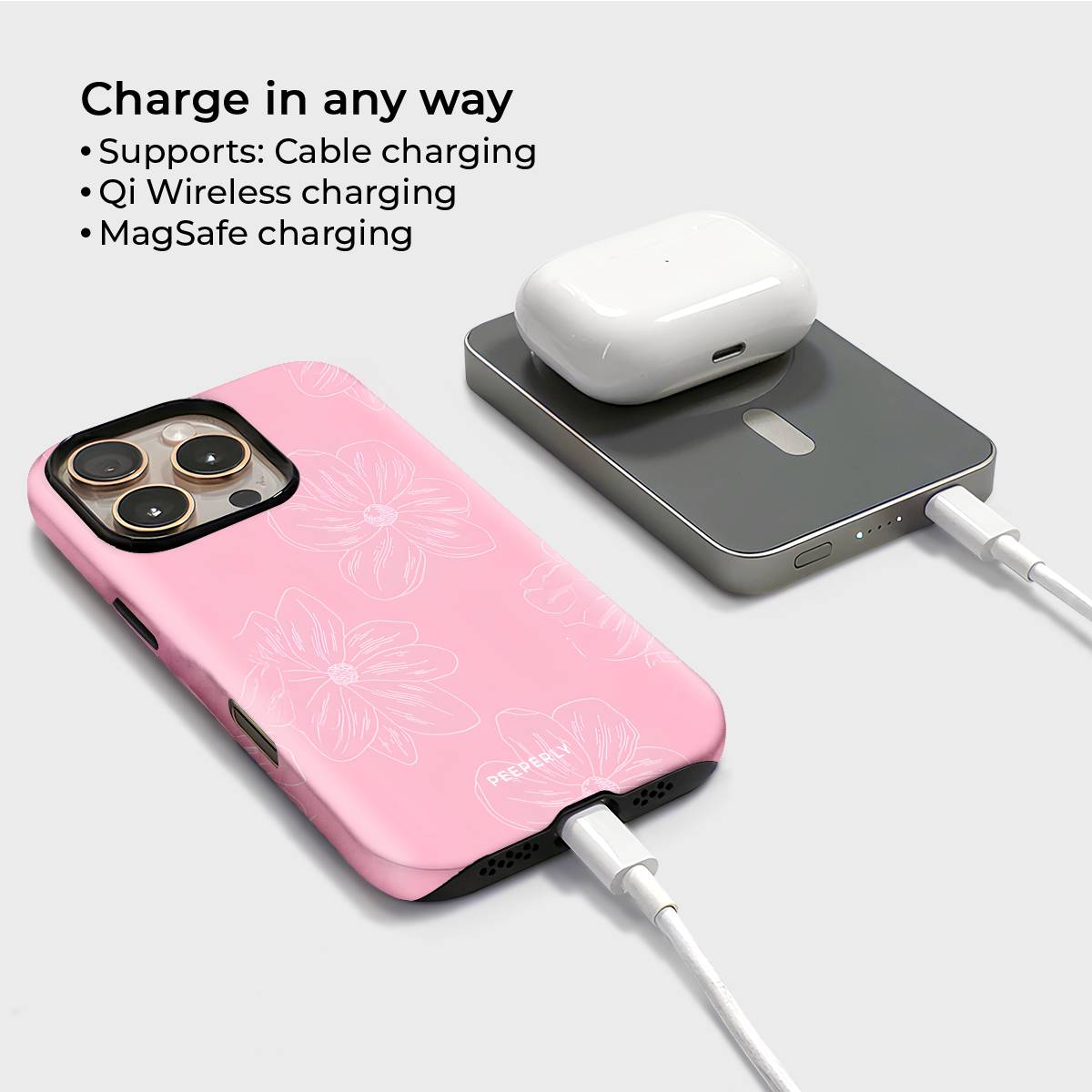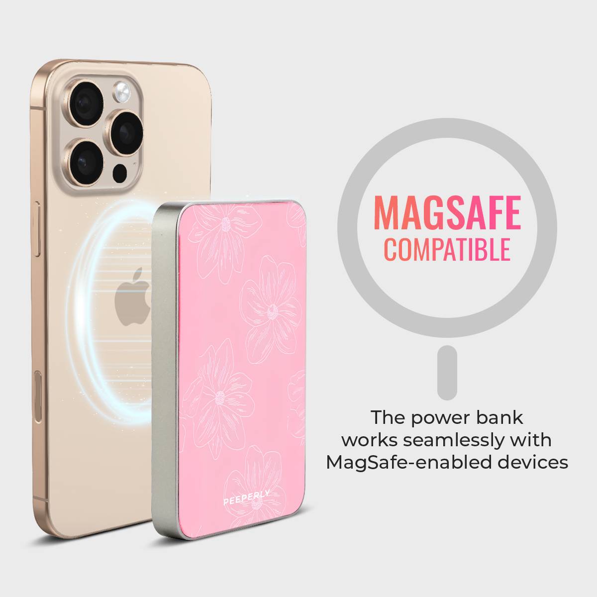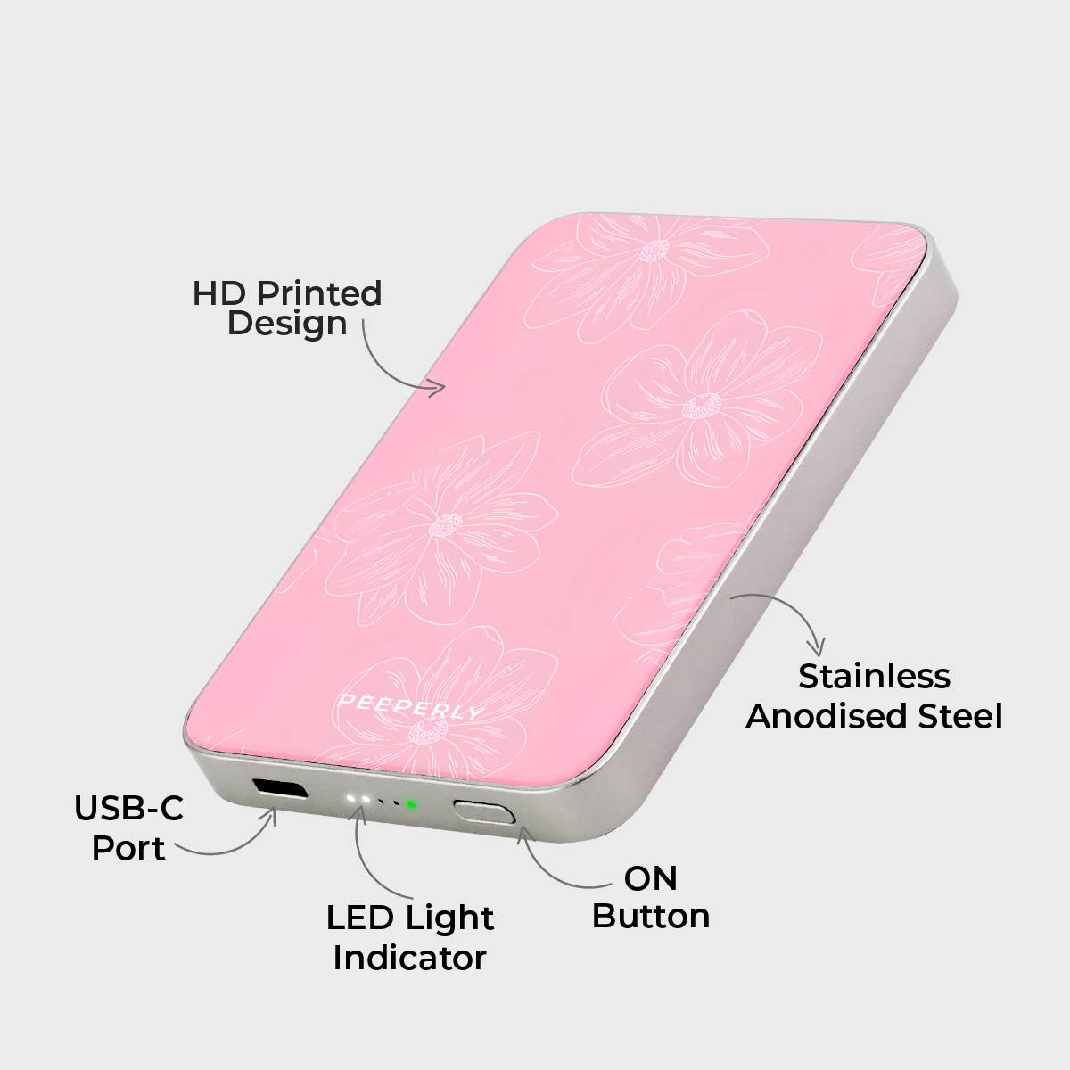 The White Flora Magnetic Power Bank features a gentle pink backdrop adorned with fine white floral line art, creating a look that’s light, airy, and beautifully understated. Minimal yet romantic, this design is perfect for those who love soft details and timeless simplicity.