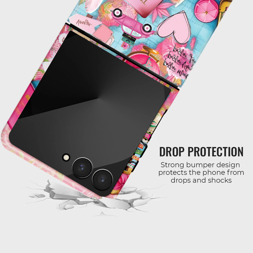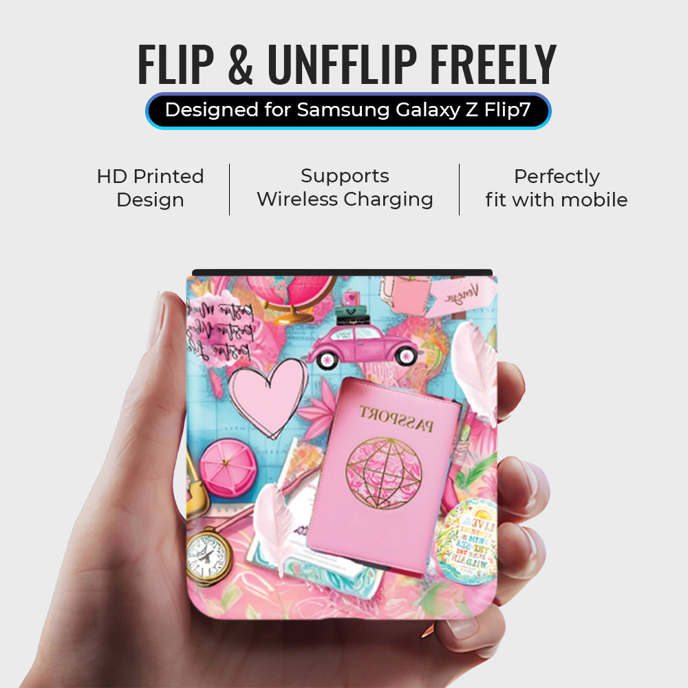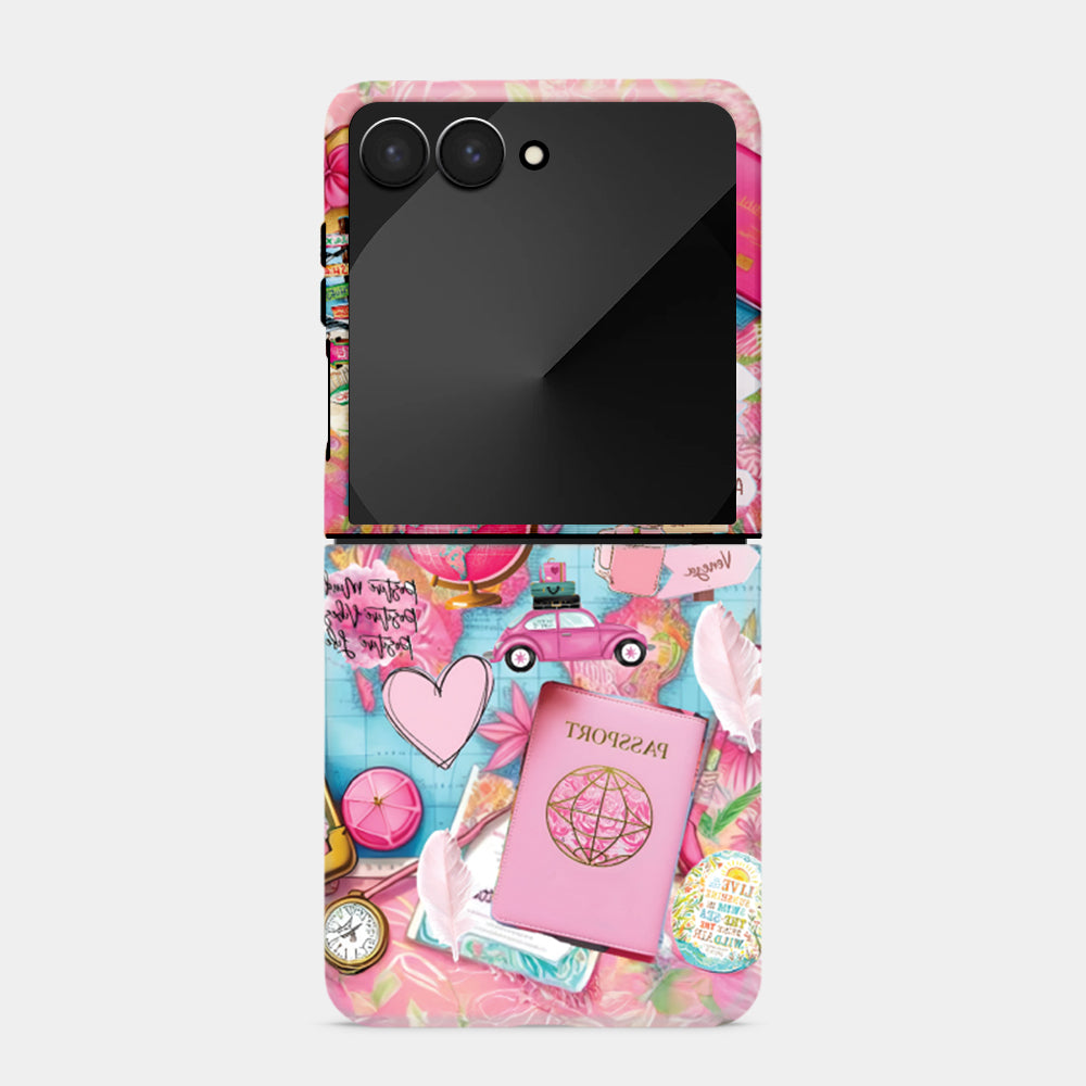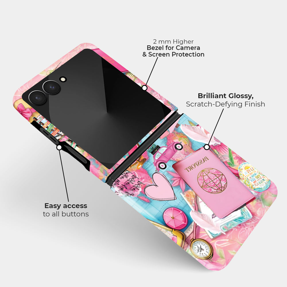 Embrace your inner globetrotter with the vibrant Travel Vibes phone case! Bursting with playful pastel pinks and sky blues, this case features a collage of iconic travel elements—from passports and globes to signposts pointing to dream destinations like Paris, Havana, and Venice. With whimsical illustrations of suitcases, vintage cars, sunglasses, and more, it captures the thrill of wanderlust in every detail.