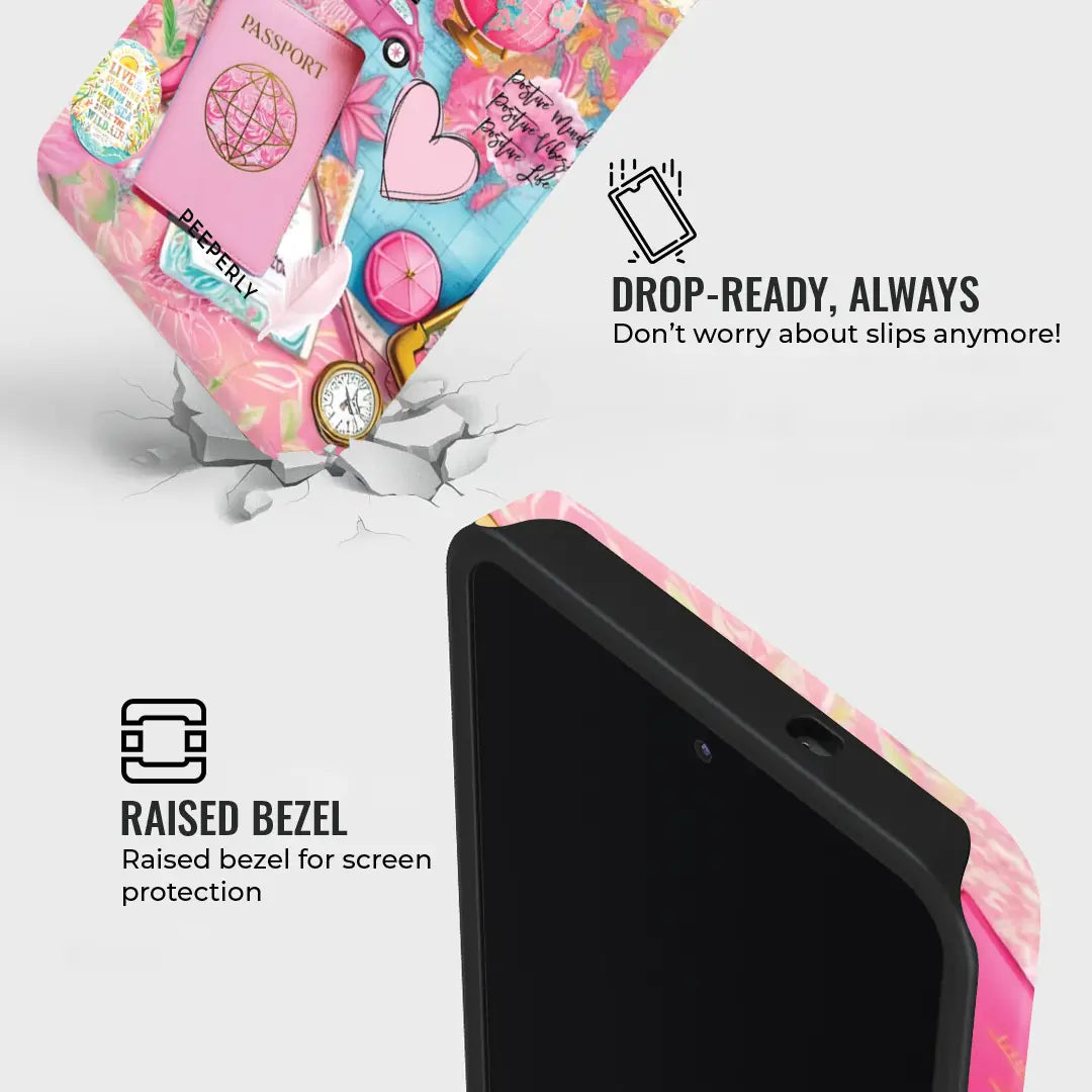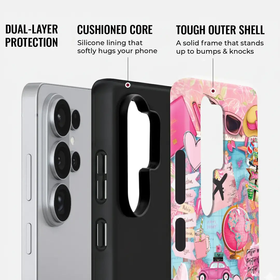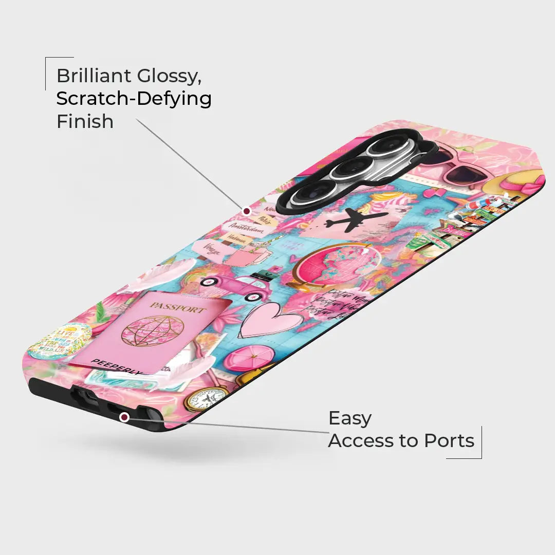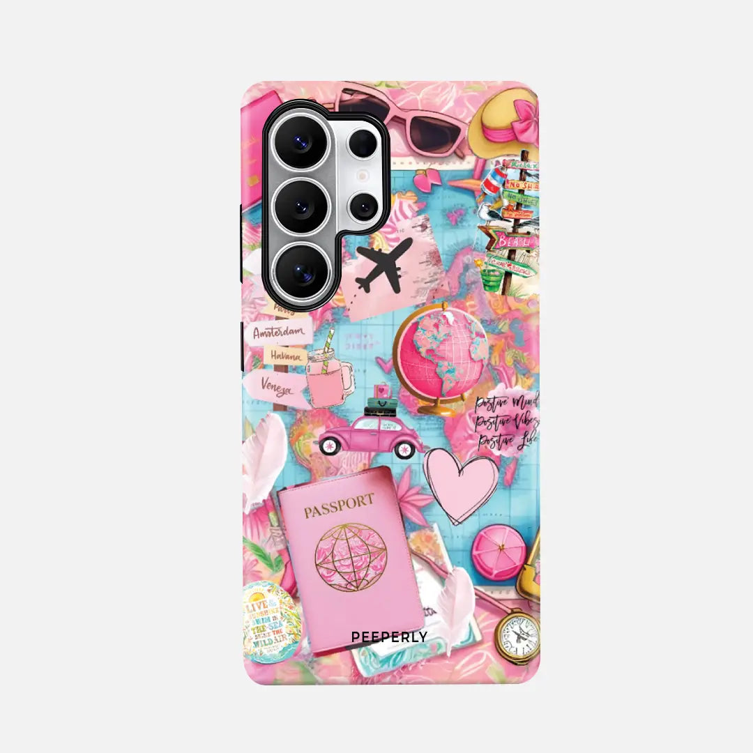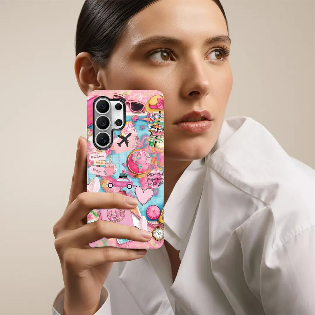 Embrace your inner globetrotter with the vibrant Travel Vibes phone case! Bursting with playful pastel pinks and sky blues, this case features a collage of iconic travel elements—from passports and globes to signposts pointing to dream destinations like Paris, Havana, and Venice. With whimsical illustrations of suitcases, vintage cars, sunglasses, and more, it captures the thrill of wanderlust in every detail.