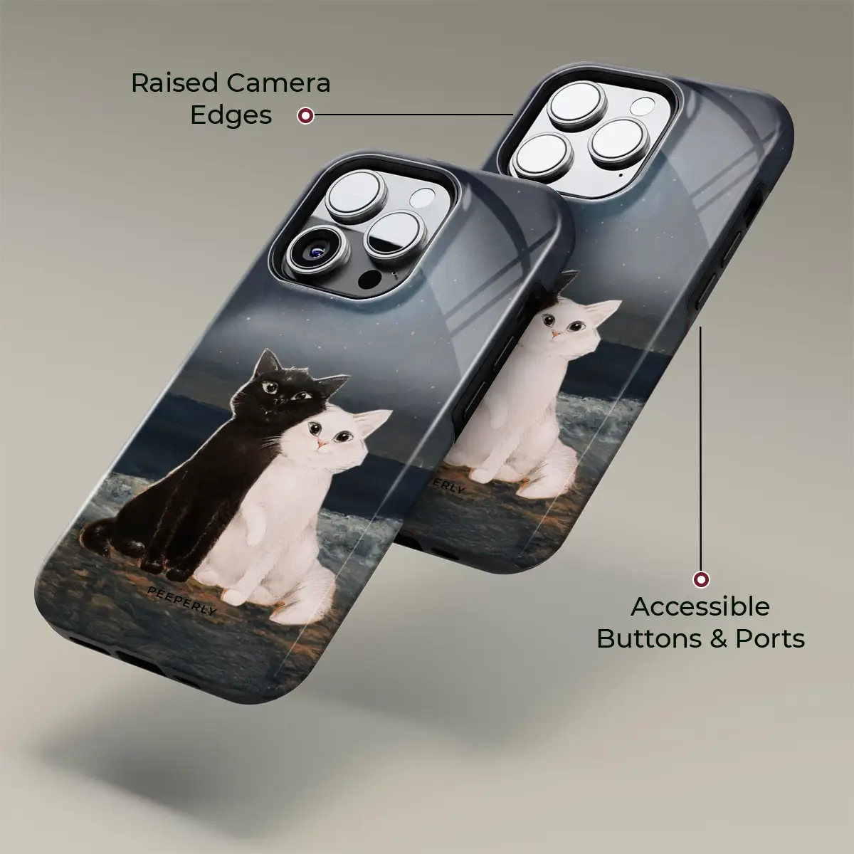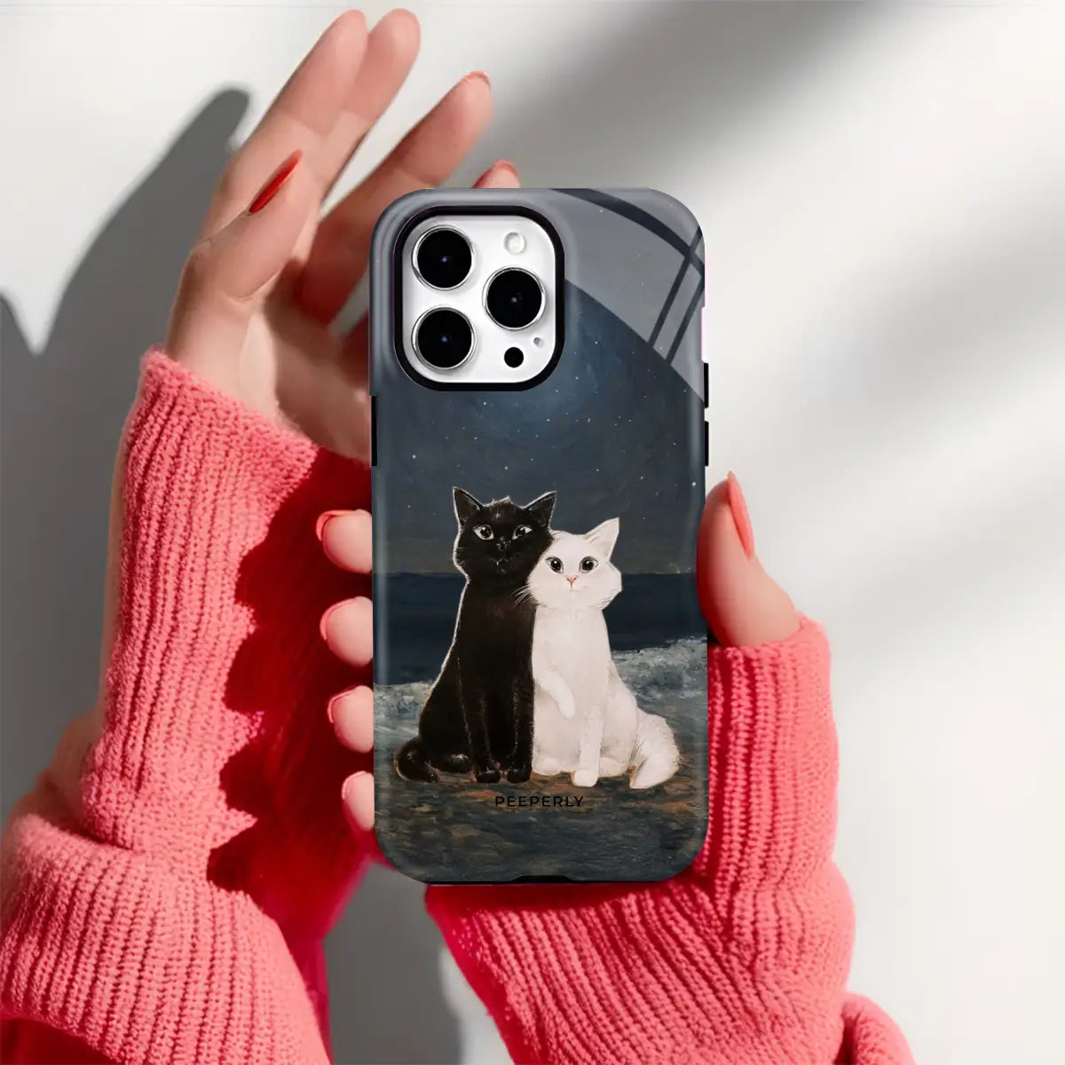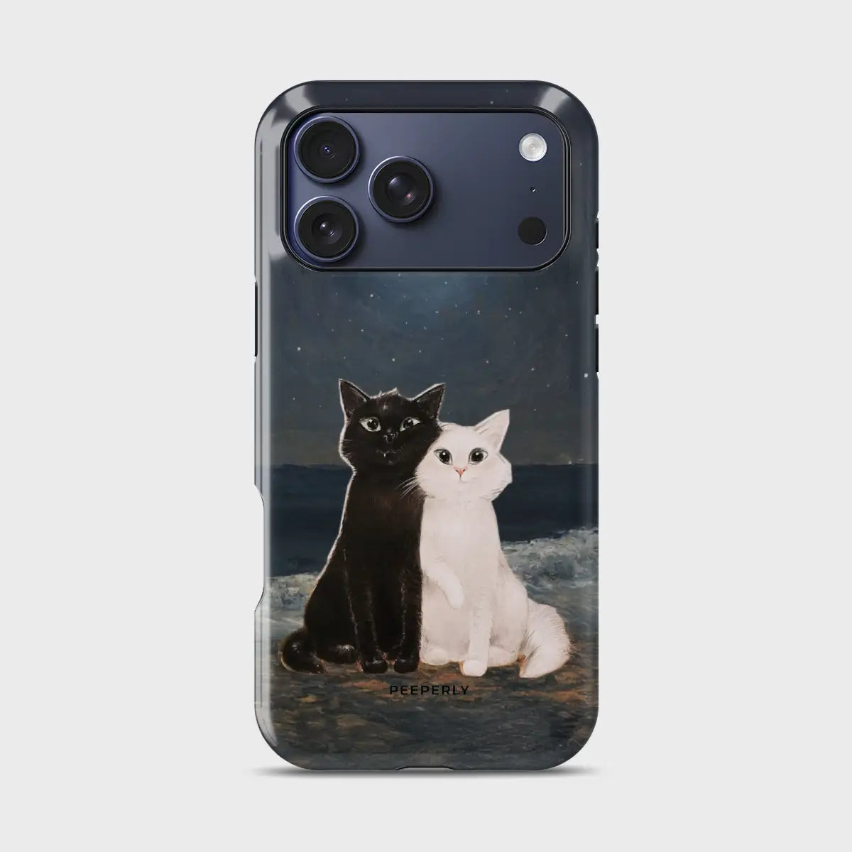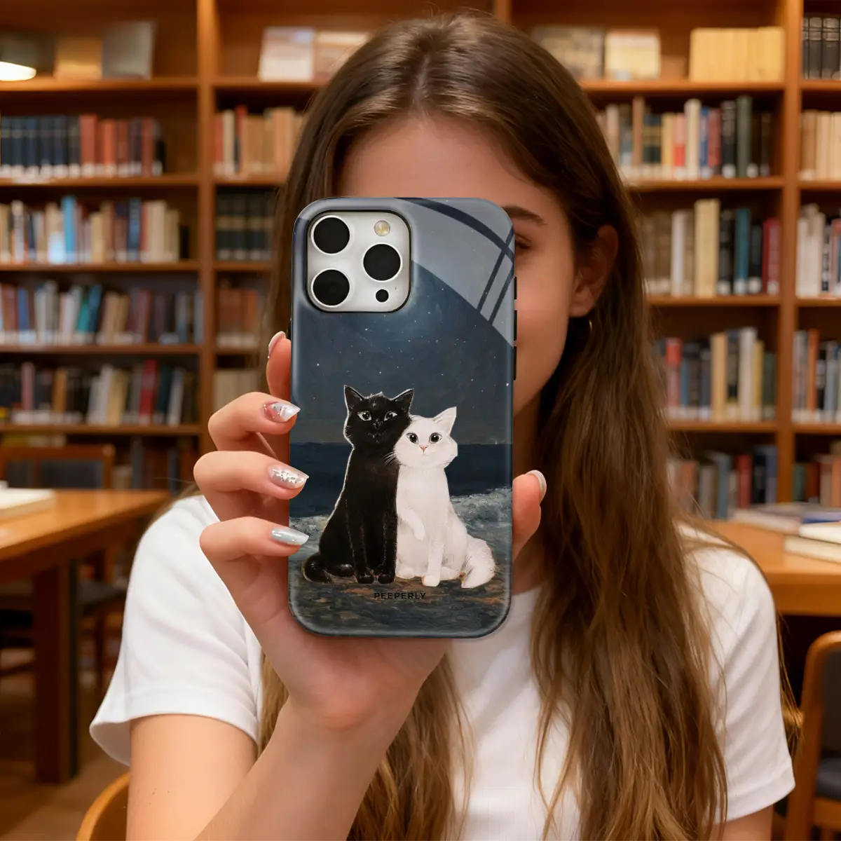 A charming and symbolic design featuring a black and white cat sitting side by side under a serene, starry night sky. Representing balance, harmony, and opposites in perfect unity, this case blends minimal elegance with a cozy, whimsical touch—perfect for cat lovers who adore meaningful and stylish designs.