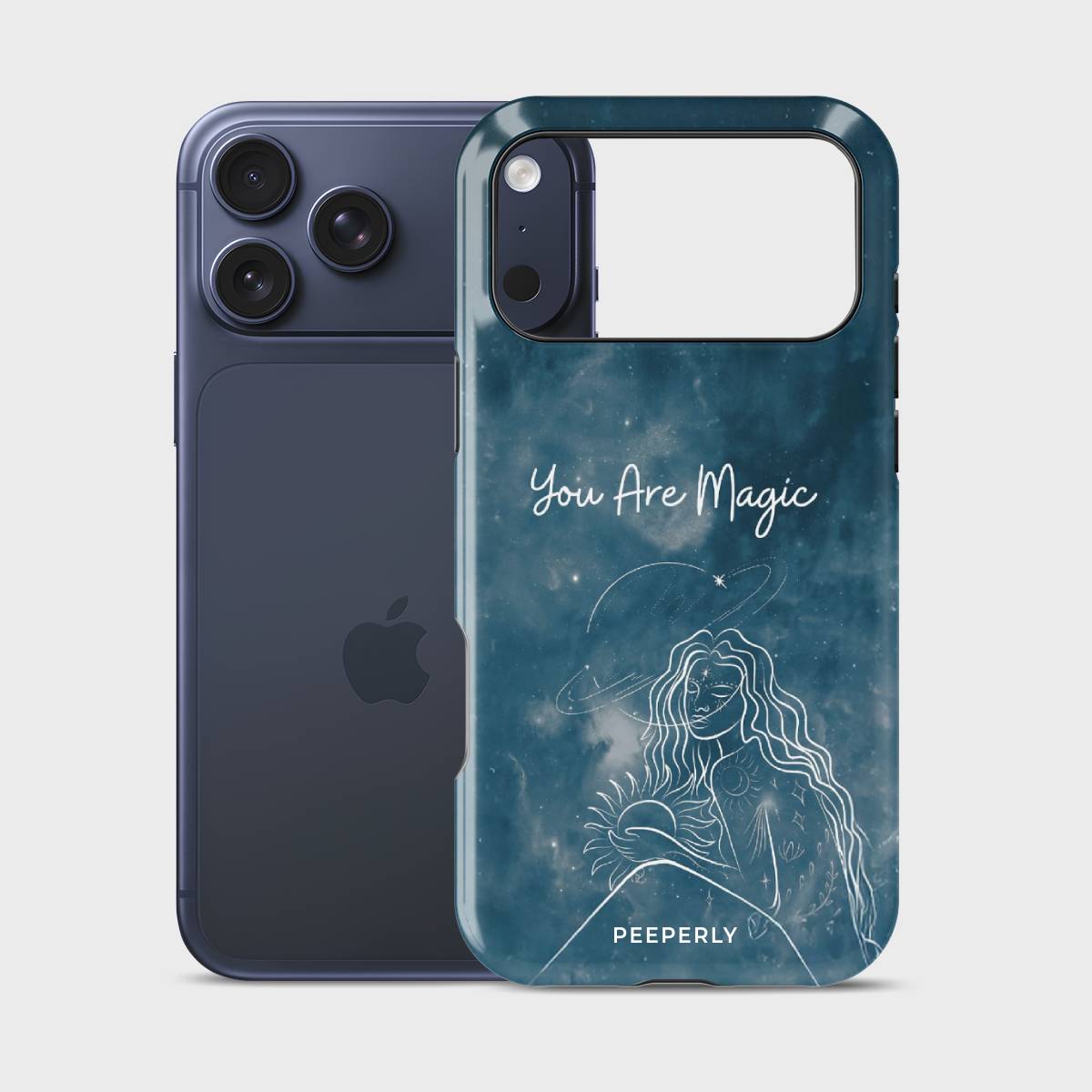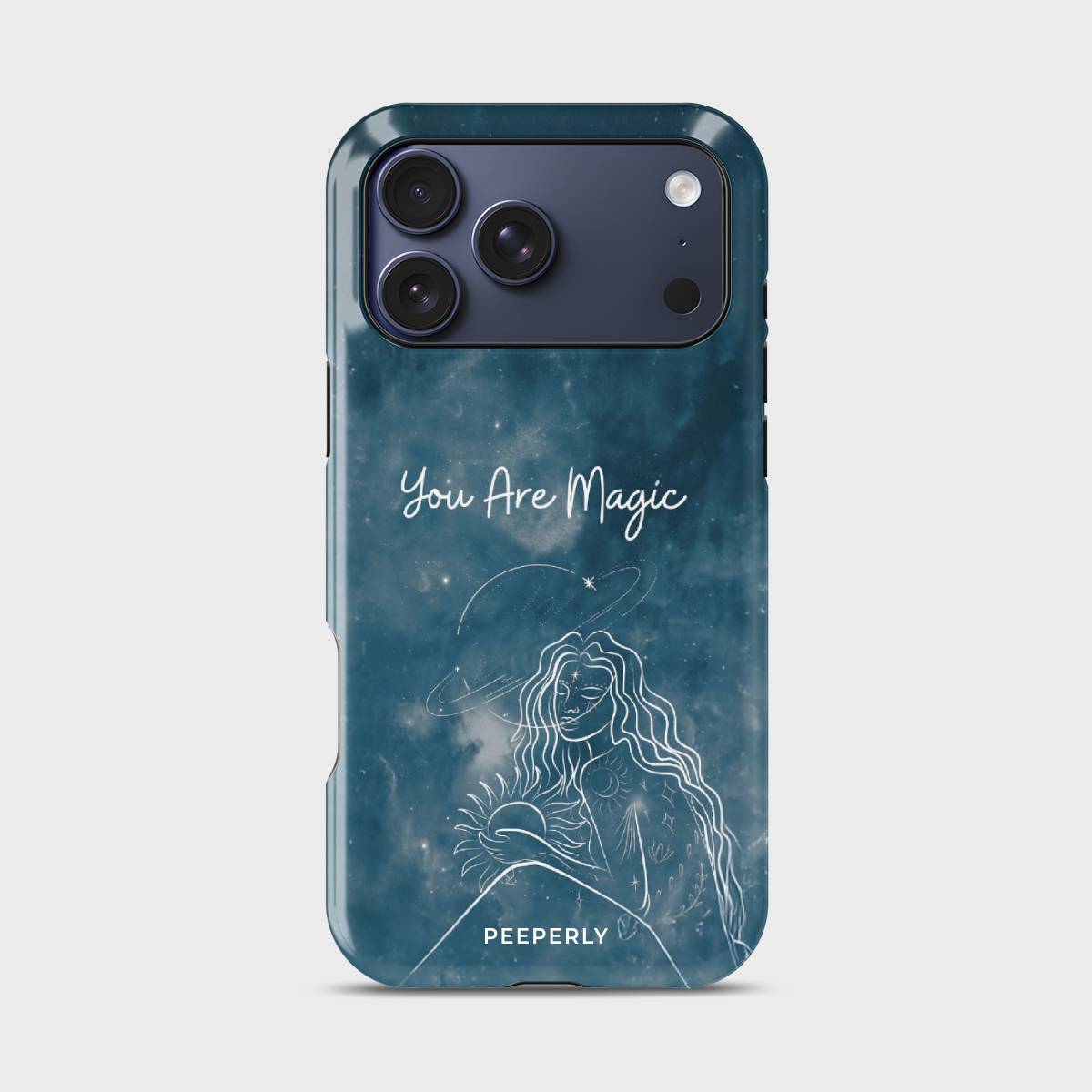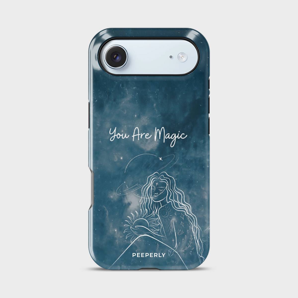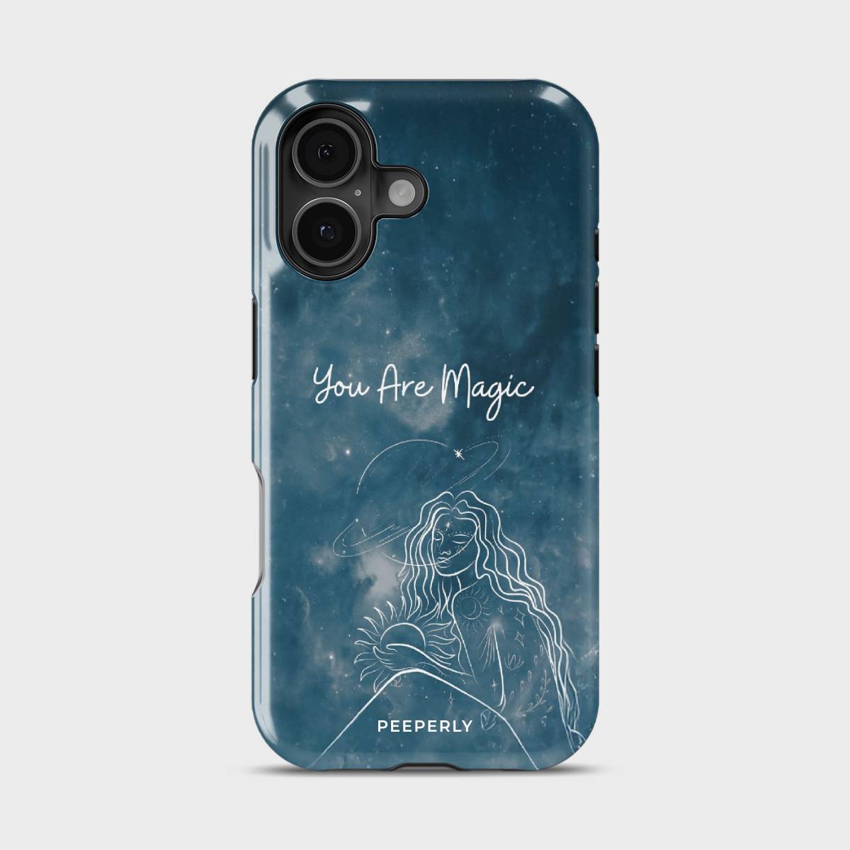 Let your phone reflect the magic you hold inside with the You Are Magic case — a celestial design that celebrates inner light, cosmic beauty, and quiet strength. Set against a deep galaxy-blue background, this case features a delicate white line illustration of a serene celestial woman surrounded by stars, planets, and a glowing sun — a reminder that you are both grounded and infinite.